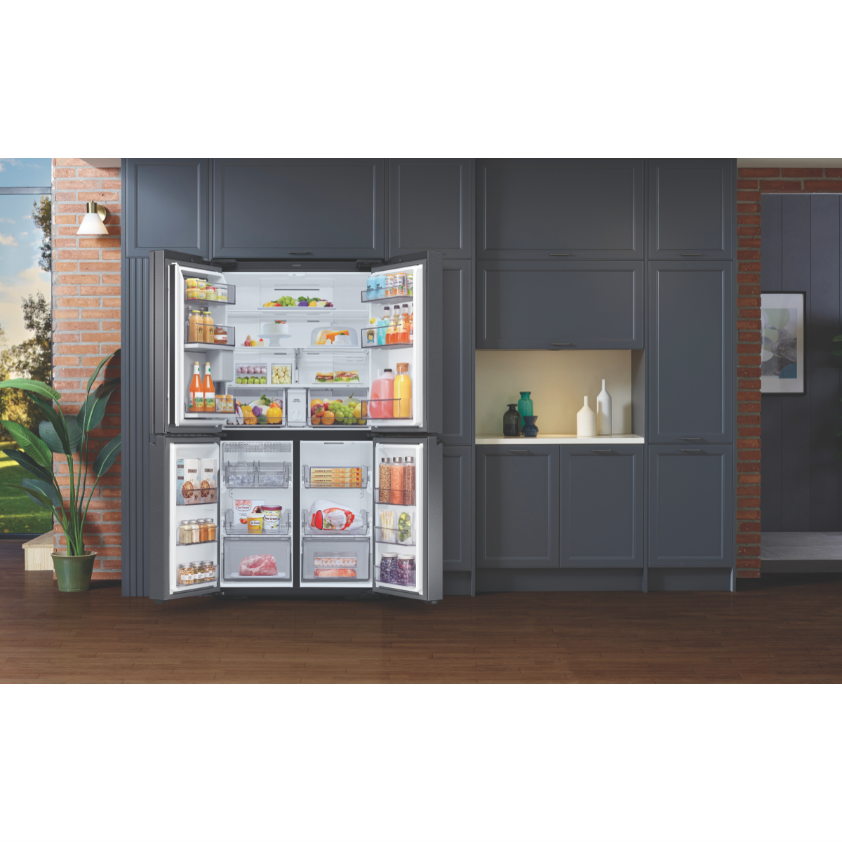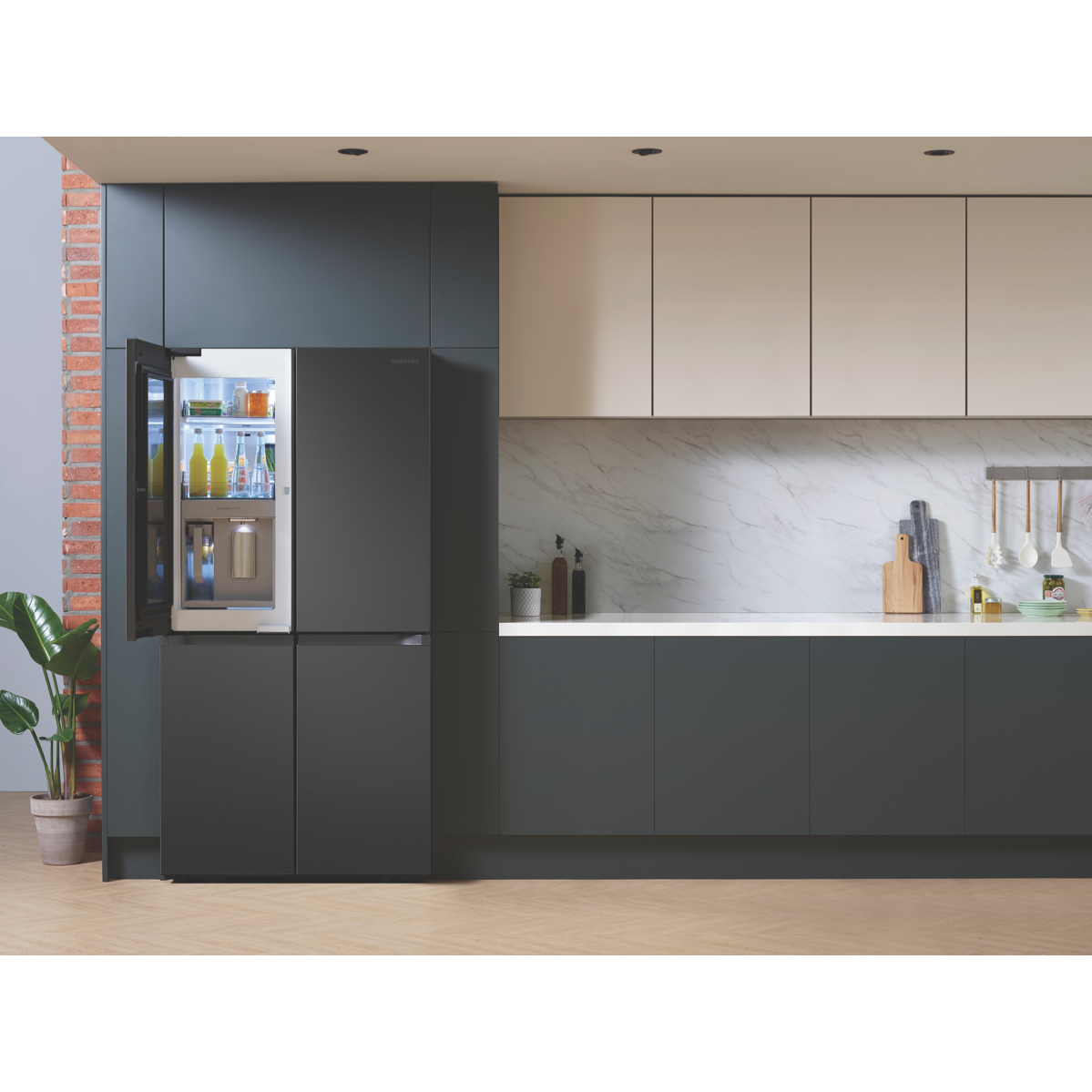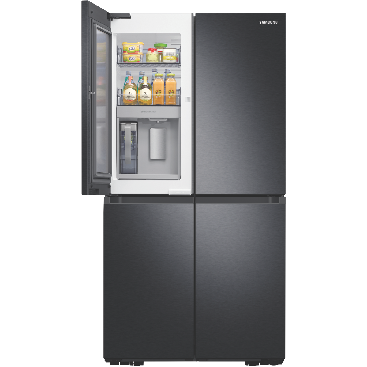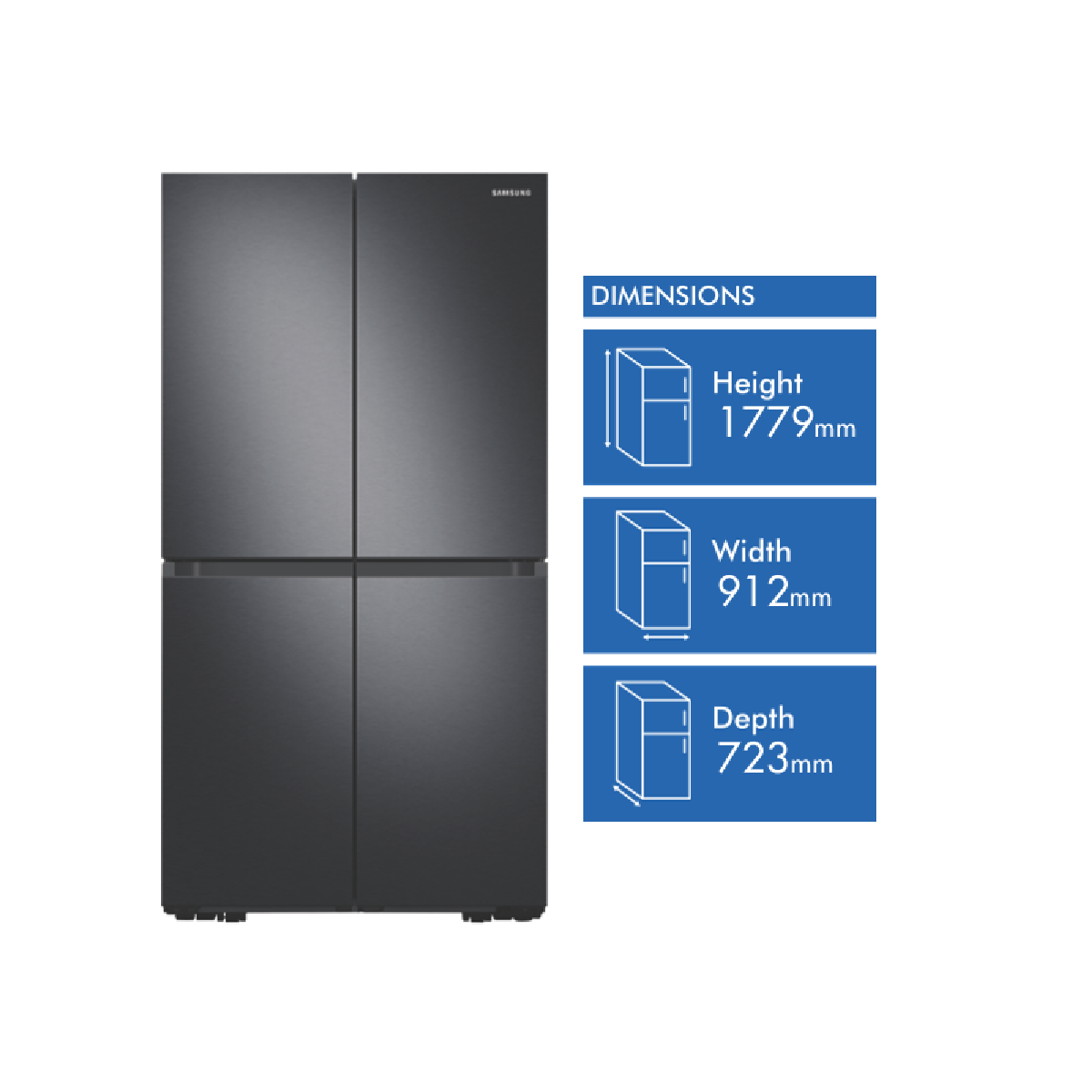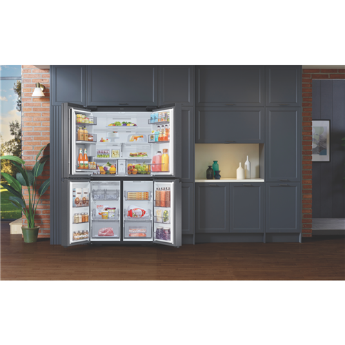 Easy access to all your drinks is available with the new Beverage Centre available with the Samsung 648L French Door Refrigerator SRF7500BB. The innovative Beverage Centre provides the autofill water jug water dispenser and drink storage all within one hygienic and handy location. The Autofill Infuser Water Jug serves cold water instantly from the fridge; for a nice change add some flavour into the infuser for a distinct pleasing taste. The Dual Ice Maker provides options to host any occasion producing both Ice Bites which quickly chill drinks and regular ice cubes. The Ice Maker can hold up to 3.1kgs of ice and is stored within the freezer to allow increase fridge cabin space. The Anti-Fingerprint Finish prevents left over hand marks from deteriorating the stylish look of the French Door exterior. Creating more internal fridge space is the Big Bottle Door Bins; these provideconvenient access to store a large variety of 3L and 2L bottles. Always have plenty of vegetables and fruits available to you in the large capacity Big Crispers. The Power Cool and Power Freeze features work to quickly cool or chill newly stored foods or drinks. All Around Cooling Technology assists maintaining cool air within the cabin by consistently checking the temperature and adjusting air flow when needed. The 648L French Door Refrigerator fits in an Australian standard 1800mm cavity and still has the capacity to contain both a dual freezer and extensive storage space.