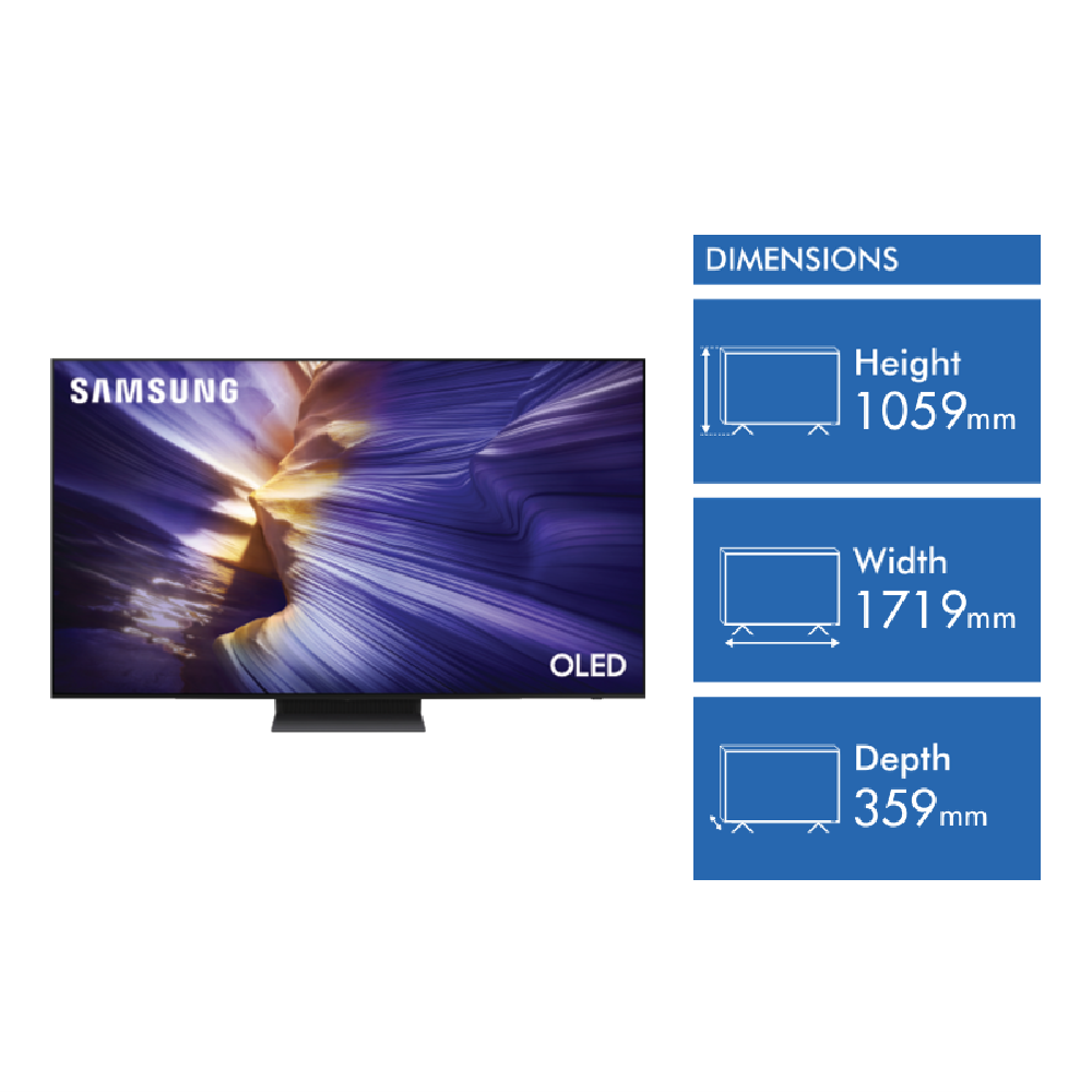 This massive 77 OLED TV delivers stunning 4K Ultra HD resolution with vibrant Quantum Dot Technology for incredible colour accuracy. The 100Hz refresh rate with 144 Motion Rate ensures smooth action whether you're watching fast-paced sports or gaming with FreeSync Premium support. Powered by the advanced NQ4 AI Gen3 processor and running on the Tizen operating system you'll enjoy smart features with voice control through multiple assistants including Alexa and Google Assistant. Connect wirelessly via Wi-Fi 5 and Bluetooth 5.3 or use the multiple HDMI and USB ports for all your devices. Comes with a 1-year warranty. Model QA77S90FAEXXY.