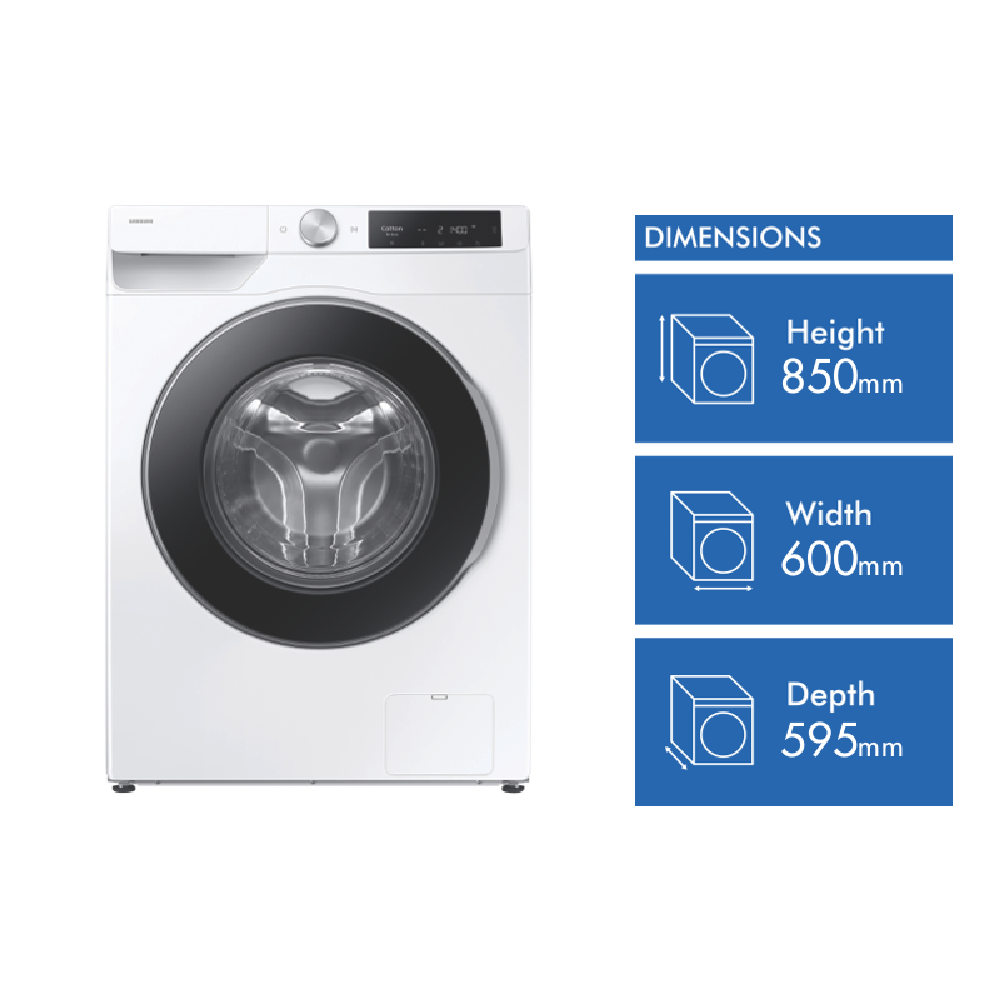This Samsung 9kg Smart Front Load Washer makes laundry day easier with its range of intelligent features. The SmartThings app lets you control and monitor your washing from your phone while AI Energy Mode optimizes each cycle for efficiency. BubbleWash and BubbleSoak technology thoroughly clean your clothes by creating powerful bubbles that penetrate fabrics. When you're in a hurry the Super Speed cycle gets your laundry done faster or choose Quick Wash 15' for those urgent items. The Steam Hygiene Cycle eliminates allergens and bacteria and there's even a Less Microfiber Cycle that reduces environmental impact. With 14 programs 5-star energy rating and 4-star water efficiency (using 93L on standard cycles) this washer balances performance with sustainability. It comes with a 2-year warranty and fits standard spaces at 850mm high 600mm wide and 595mm deep. Model WW90DG6U34LE.
