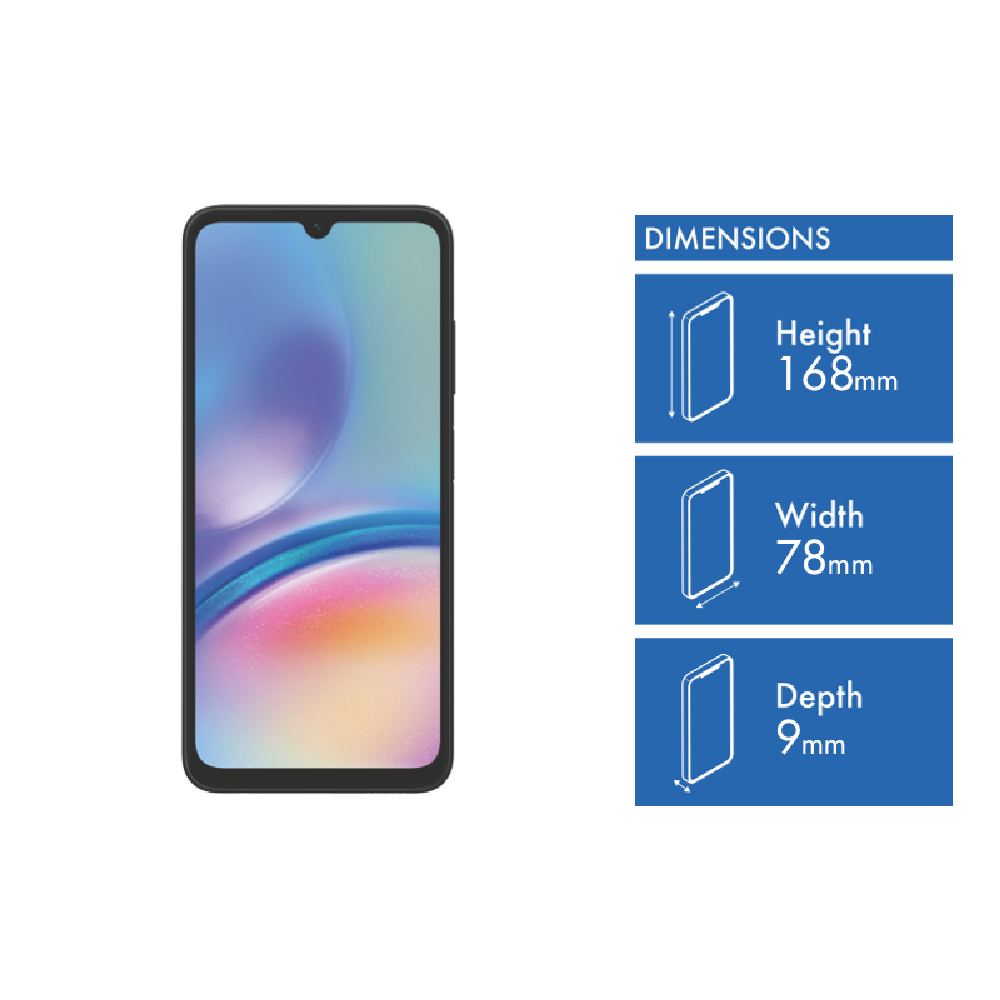 The Samsung Galaxy A05S 128GB phone gives you the power and performance to keep going all day. Equipped with a large 6.7-inch Full HD+ Infinity U display and a long-lasting 5000mAh battery this Android smartphone has what it takes for superior everyday use. The expansive screen delivers vivid visuals and immersive entertainment while the huge battery provides incredible uptime. With 128GB of storage you'll have plenty of room for apps photos videos and more. The 50MP rear camera captures sharp detailed shots even in low light while the 13MP front camera is perfect for selfies and video calls. Plus the Snapdragon 680 processor and 4GB of RAM keep everything running smoothly. Connect via Wi-Fi Bluetooth and GPS while keeping your data secure with the fingerprint sensor. Weighing just 194g the slim and lightweight Galaxy A05S fits comfortably in your hand. Available in sophisticated black it comes with a 24-month manufacturer's warranty. Part number 11901313208.