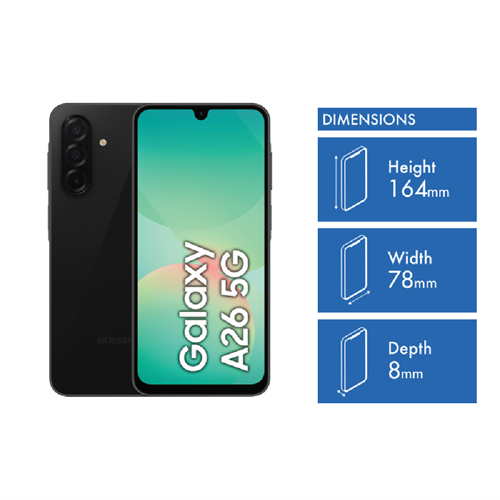 Experience the Galaxy A26 5G with its stunning 6.7-inch Super AMOLED display that delivers vibrant visuals at a smooth 120Hz refresh rate. This large smartphone packs 128GB of storage expandable via MicroSD up to 2TB giving you plenty of space for photos captured with the impressive 50MP triple rear camera. Stay connected with fast 5G networking and enjoy worry-free use thanks to its IP67 water resistance rating. The long-lasting 5000mAh battery lets you watch videos for up to 17 hours on a single charge. Comes with a 2-year warranty. Model 11901336091.