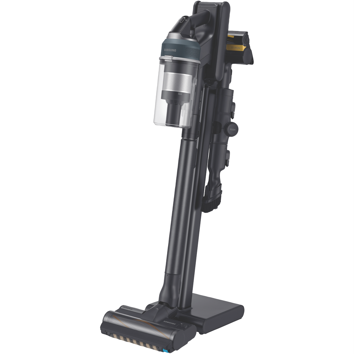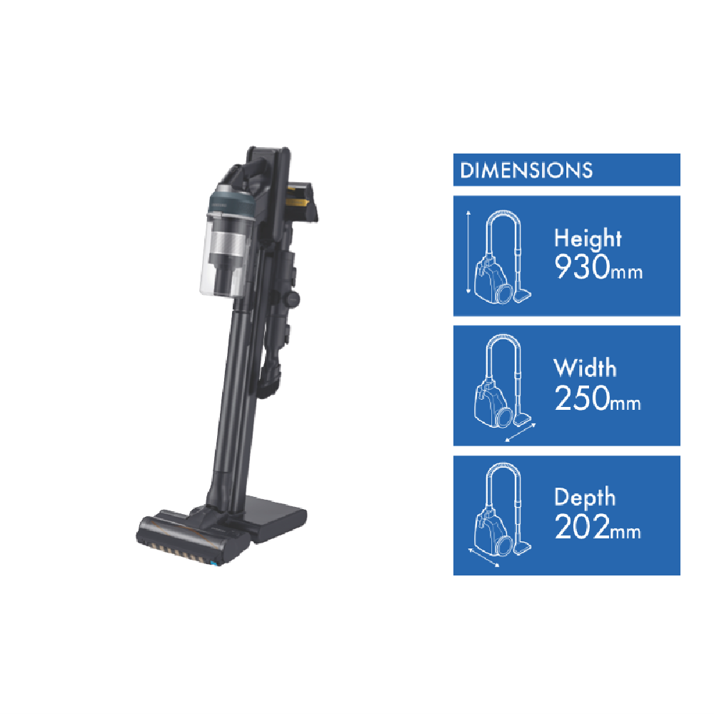 Step into a new era of cordless cleaning with the Samsung Jet 95 Complete Cordless Vacuum in Midnight Blue. This powerful stick vacuum packs a punch with 210W of suction power to lift dirt and debris from carpets and hard floors. The lightweight 2.51kg design and 60 minute runtime allow you to maneuver into hard-to-reach areas and clean your entire home in one go. The Jet Dual Brush effortlessly glides from hard floors to carpets while the Slim LED Brush illuminates hidden dust in hard-to-see areas. Tackle pet hair with the specialized Pet Tool + for furniture stairs and upholstery. Extend your reach with the Combination Tool Extension Crevice Tool and Flexible Tool to clean ceilings blinds drapes and more. With a generous 0.8L dust bin capacity and washable filters you can clean longer before stopping to empty. Recharge fully in just 210 minutes and be cleaning again in no time. This vacuum comes complete with the Z Station for tidying up cords and conveniently storing your tools. Backed by a 2 year manufacturer's warranty the Samsung Jet 95 Cordless Vacuum provides the freedom to clean your whole home without cords getting in the way. The manufacturer's part number for this product is VS20C9544TB. Bring home this powerful lightweight cleaning companion today. Disclaimers: (1)Based on internal testing in accordance with the IEC 62885-4 CL.5.8 standard. Measured at the inlet of the non-accessorized tool using Jet Mode and a battery that is fully charged. Results may vary depending on actual usage.(2)The stated run time applies when using a high capacity battery (2000mA) and the minimum power level with a non motorized tool attached. Results may vary depending on actual usage.