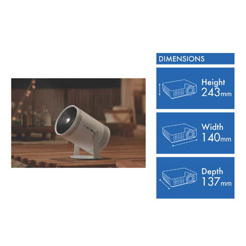 Take your home entertainment to the next level with the Samsung The Freestyle Portable Smart FHD Projector. This innovative projector features a 100 screen size with Full HD resolution powered by Samsung's PurColour technology delivering vivid cinematic visuals in any room. The built-in Tizen operating system and Dolby Digital Plus audio provide smart connectivity and immersive sound. With just one HDMI input WiFi5 and Bluetooth 5.2 setup is a breeze. Measuring 243mm high 140mm wide and 137mm deep this ultra-portable 1.4kg projector can be easily positioned anywhere desired. Released in 2023 and backed by a 1 year manufacturer's warranty the Freestyle projector is perfect for transforming blank walls into makeshift movie screens. Let your imagination run wild and enjoy entertainment like never before - check out the Samsung The Freestyle today. The manufacturer's part number for this product is SP-LFF3CLAXXXY.