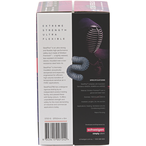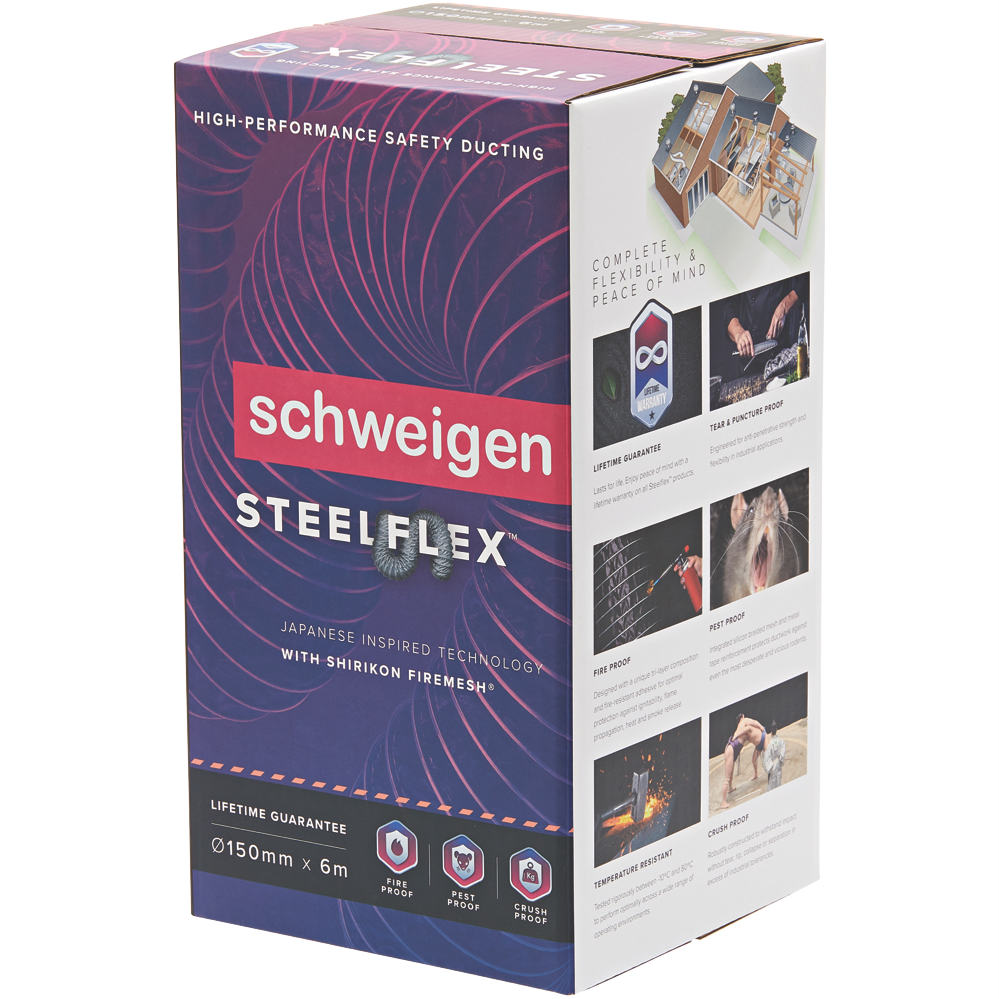 Schweigen SteelFlex is an ultra-strong and flexible high-performance safety ducting designed for quiet and efficient high-volume transfers of temperature-sensitive air. Lifetime Guarantee: Enjoy peace of mind with limited lifetime warranties. Superior Performance: Independently tested to offer unbeatable strength and safety for even the most demanding industrial and commercial HVAC applications. Quieter: Acoustically damped for extreme low resonance turbulence and noise. Bacteria Shield: Treated with an advanced antimicrobial coating to resist pollutant build-up and the spread of surface bacteria. Mould Resistant: Inoculated against mould and mildew growth to ensure product integrity and performance in high-humidity operating environments. Temperature Resistant: Tested between -10ºC and 80ºC to perform optimally across a wide range of operating environments. Fireproof: Designed with Shirikon Firemesh® for optimal protection against ignitability flame propagation heat and smoke release. Pest Proof: Integrated braided mesh and metal tape reinforcement protects ductwork against even the most desperate and vicious rodents. Crush Proof: Robustly constructed to withstand impact without tear rip collapse or separation in excess of industrial tolerances. Tear & Puncture Proof: Engineered for anti-penetrative strength and flexibility in industrial applications. Safer & Easier to install: Comes right-sized and ready-cut for quicker and safer installs by specialists and DIY enthusiasts alike.
