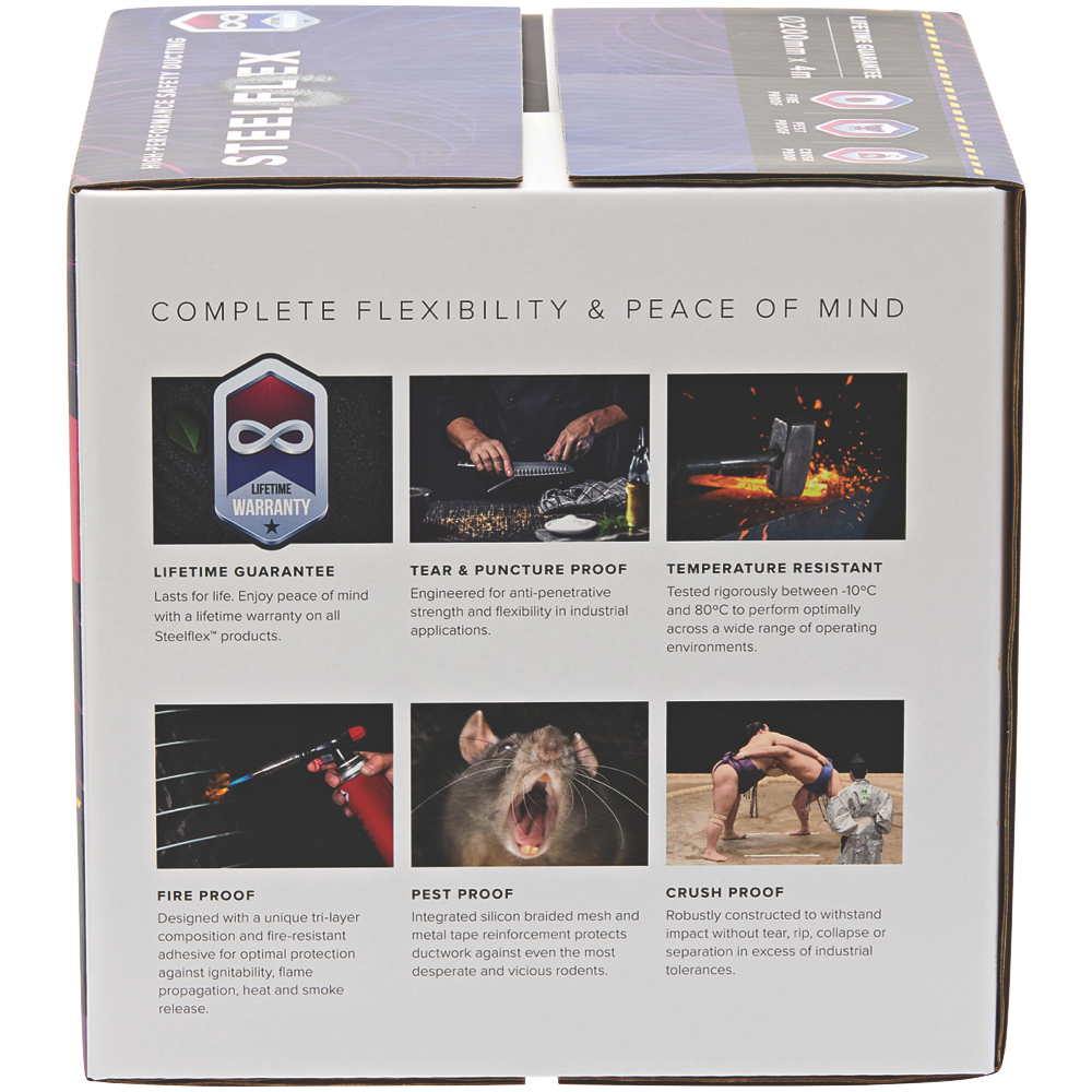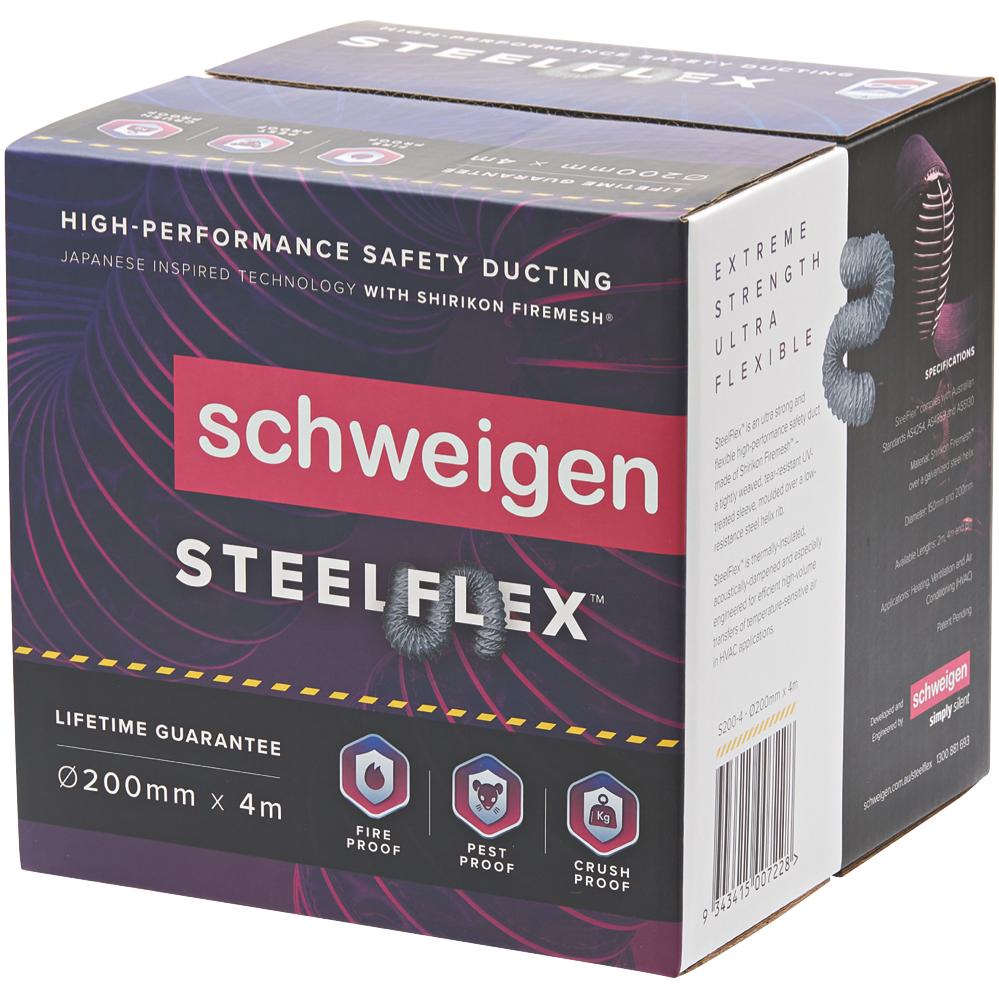 Schweigen SteelFlex is an ultra-strong and flexible high-performance safety ducting designed for quiet and efficient high-volume transfers of temperature-sensitive air. Lifetime Guarantee: Enjoy peace of mind with limited lifetime warranties. Superior Performance: Independently tested to offer unbeatable strength and safety for even the most demanding industrial and commercial HVAC applications. Quieter: Acoustically damped for extreme low resonance turbulence and noise. Bacteria Shield: Treated with an advanced antimicrobial coating to resist pollutant build-up and the spread of surface bacteria. Mould Resistant: Inoculated against mould and mildew growth to ensure product integrity and performance in high-humidity operating environments. Temperature Resistant: Tested between -10ºC and 80ºC toperform optimally across a wide range of operating environments. Fireproof: Designed with Shirikon Firemesh® for optimal protection against ignitability flame propagation heat and smoke release. Pest Proof: Integrated braided mesh and metal tape reinforcement protects ductwork against even the most desperate and vicious rodents. Crush Proof: Robustly constructed to withstand impact without tear rip collapse or separation in excess of industrial tolerances. Tear & Puncture Proof: Engineered for anti-penetrative strength and flexibility in industrial applications. Safer & Easier to install: Comes right-sized and ready-cut for quicker and safer installs by specialists and DIY enthusiasts alike.