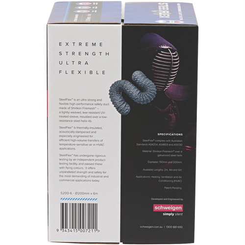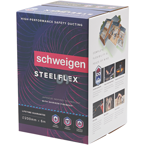 Schweigen SteelFlex is an ultra-strong and flexible high-performance safety ducting designed for quiet and efficient high-volume transfers of temperature-sensitive air. Lifetime Guarantee: Enjoy peace of mind with limited lifetime warranties. Superior Performance: Independently tested to offer unbeatable strength and safety for even the most demanding industrial and commercial HVAC applications. Quieter: Acoustically damped for extreme low resonance turbulence and noise. Bacteria Shield: Treated with an advanced antimicrobial coating to resist pollutant build-up and the spread of surface bacteria. Mould Resistant: Inoculated against mould and mildew growth to ensure product integrity and performance in high-humidity operating environments. Temperature Resistant: Tested between -10ºC and 80ºC toperform optimally across a wide range of operating environments. Fireproof: Designed with Shirikon Firemesh® for optimal protection against ignitability flame propagation heat and smoke release. Pest Proof: Integrated braided mesh and metal tape reinforcement protects ductwork against even the most desperate and vicious rodents. Crush Proof: Robustly constructed to withstand impact without tear rip collapse or separation in excess of industrial tolerances. Tear & Puncture Proof: Engineered for anti-penetrative strength and flexibility in industrial applications. Safer & Easier to install: Comes right-sized and ready-cut for quicker and safer installs by specialists and DIY enthusiasts alike.