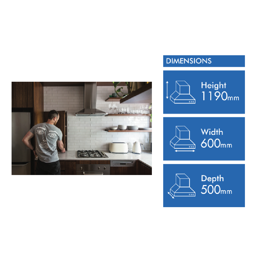 • 60cm ducted canopy with 2 x 3 Watt LED lights