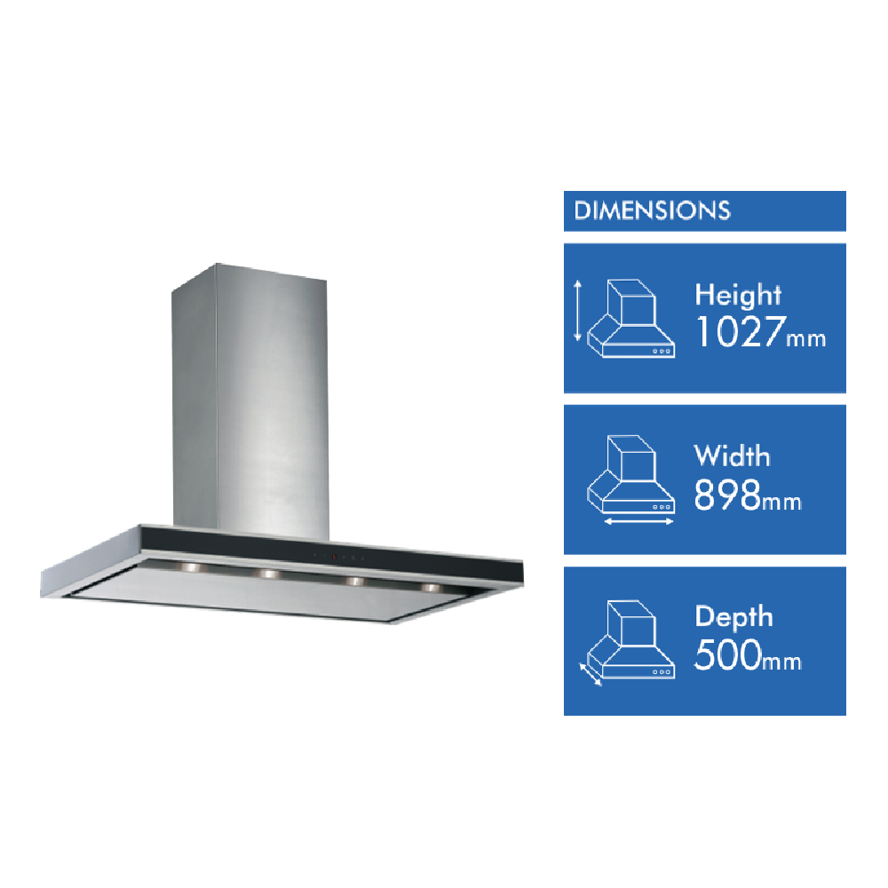 Elevate your kitchen with the Schweigen 90cm Silent Canopy Rangehood featuring sleek stainless steel and black glass for a modern look. This powerful external motor rangehood boasts 1600m3/hr extraction capacity for efficiently removing steam grease and odours. Equipped with brilliant LED lighting to illuminate your cooking surface while aluminium filters trap grease and are easy to clean. Enjoy whisper-quiet operation due to the silent motor. With a generous 900mm width this wall canopy rangehood will make a statement in your kitchen. Seamlessly duct air outside through the included 6 meters of ducting. Designed for longevity with a durable stainless steel finish plus backed by a 10 year motor warranty for peace of mind. Keep your kitchen fresher for longer with this feature-packed 90cm rangehood. The manufacturer's part number for this product is DS3326-9SP. Discover the difference a Schweigen rangehood can make in your home today.