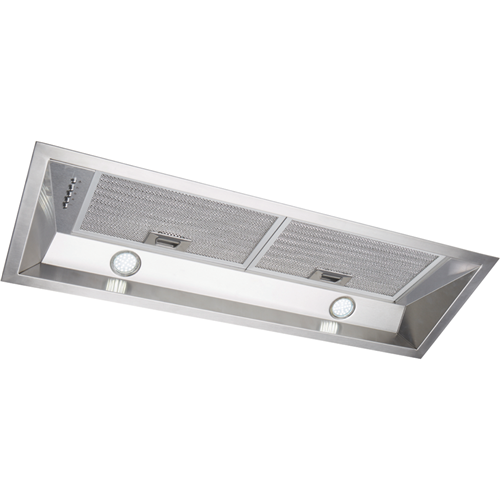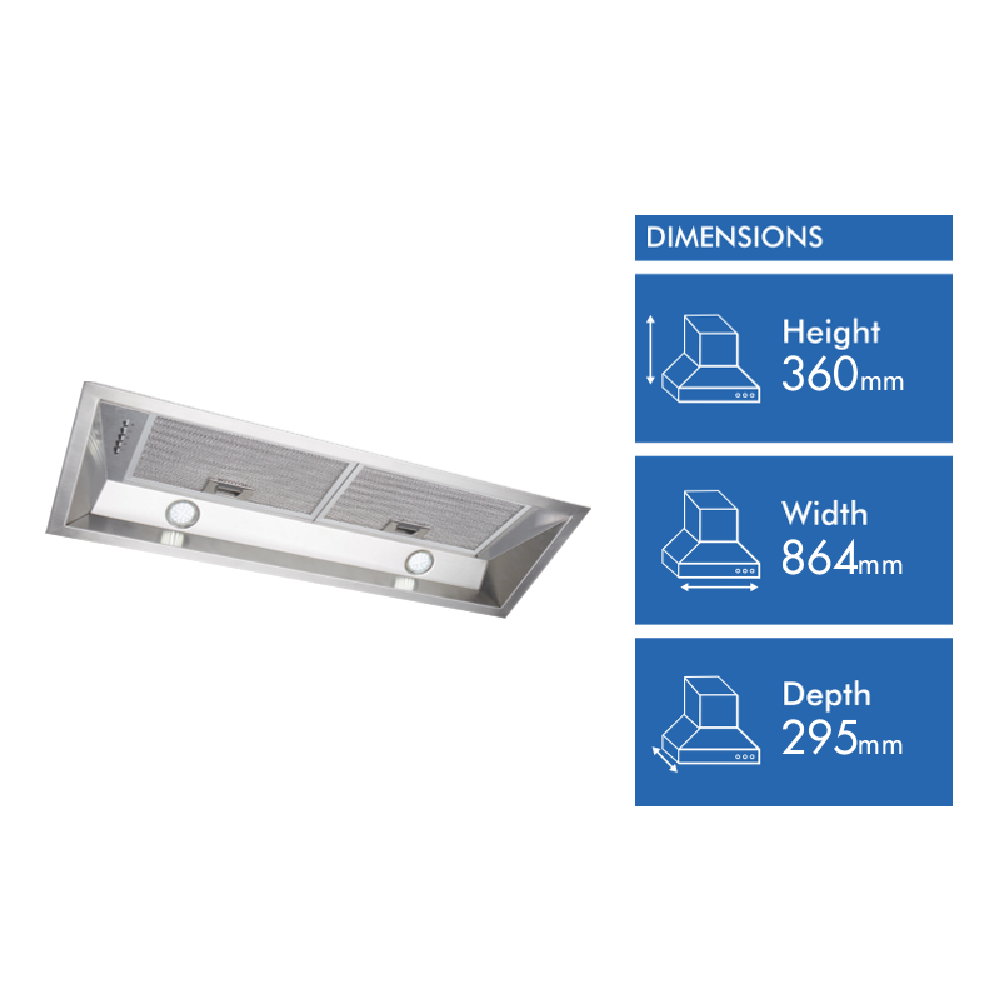 Enhance your kitchen with the sleek modern Schweigen 90cm Undermount Rangehood. This stainless steel undermount rangehood boasts a width of 864mm and height of 359mm to perfectly fit under your cabinetry. With powerful 1080m3/hr extraction capacity from its ultra-quiet centrifugal motor and 3 fan speeds this rangehood effectively removes steam grease and odours. The integrated LED lights illuminate your cooktop while the push button controls allow easy operation. Its 2 aluminium filters are dishwasher safe for simple cleaning. This ducted rangehood also includes a 3 year warranty and lifetime filter warranty for peace of mind. With a stylish finish simple maintenance and effective performance the Schweigen 90cm Undermount Rangehood will keep your kitchen fresh and tidy. The manufacturer's part number for this product is GG-901. Transform your cooking space with this high quality undermount rangehood today.