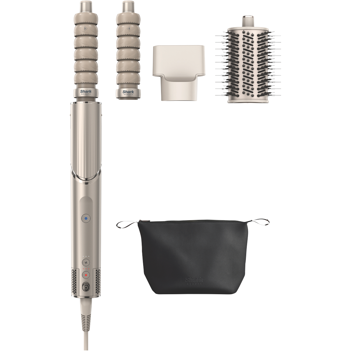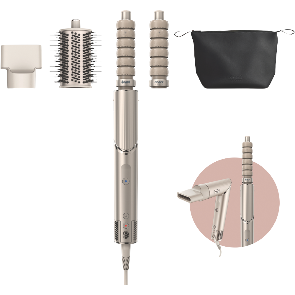 Transform your hair styling routine with the Shark FlexStyle Air Styling And Drying System in Stone. This clever 2-in-1 device works as both a powerful hair dryer and versatile multi-styler for all hair types - straight wavy curly or coily. Just twist to switch between drying and styling modes. The system measures temperatures 1000 times per second minimising heat damage while you style. With 4 heat settings 3 airflow speeds and a cool shot you'll have complete control. The Coanda Technology uses two air streams to attract hair and tame frizz for a smooth glossy finish. Weighing just 0.66kg without attachments it's comfortable to use and the 2.8m cord gives you plenty of movement. The package includes a styling concentrator oval brush two 3.5cm auto-wrap curlers for different directions and a soft storage bag. Powered by 1650 watts it delivers fast drying and precise styling in one compact device. Model HD421SL comes with a 2 year manufacturer's warranty.