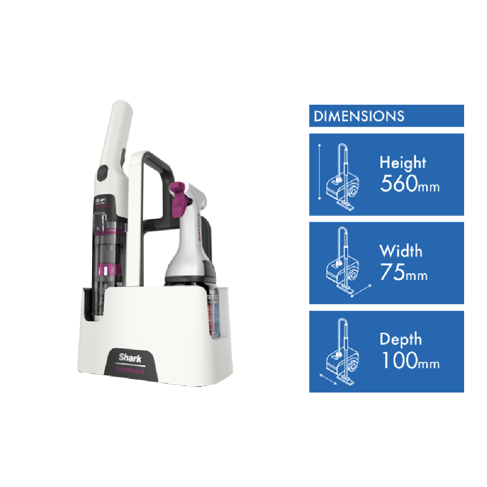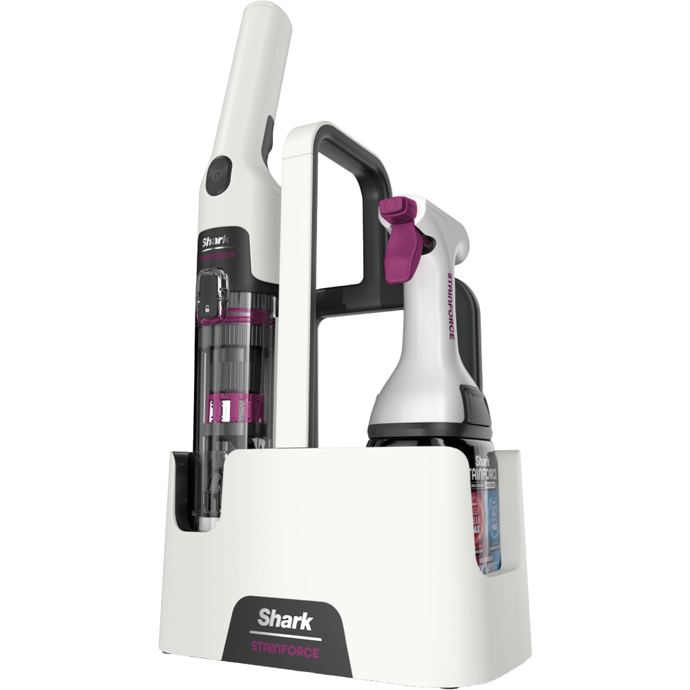 Stops stains in their track anytime anywhere with Shark StainForce. Ultra-poweful suction and 30x more stain-fighting power(1) combine to deliver unbeatable tough stain removal. Cordless and always ready when you need it. A uniquely designed Grab & Go Caddy stores your StainForce accessories and chemical solution allowing you to get to the mess for a quick clean.