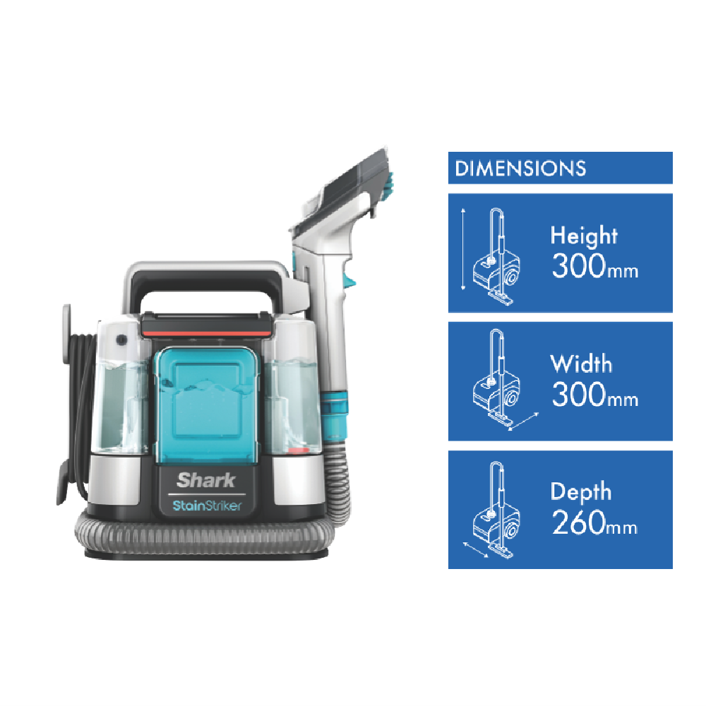 Tackle those tough stains with the Shark StainStriker Portable Carpet & Upholstery Cleaner (PX200ANZ). This compact spot cleaner weighs just under 4 kg making it easy to carry around your home. The 3.6 m cord gives you plenty of reach to clean carpets and upholstery. You'll get an integrated crevice tool pet tool stain tool and wide stain tool to handle any mess. Plus it comes with a 354ml bottle of Shark Stainstriker OXY Multiplier Formula and 177ml of Shark CarpetXpert Deep Clean Pro to leave your surfaces looking fresh. Backed by a 2-year manufacturer's warranty for peace of mind.