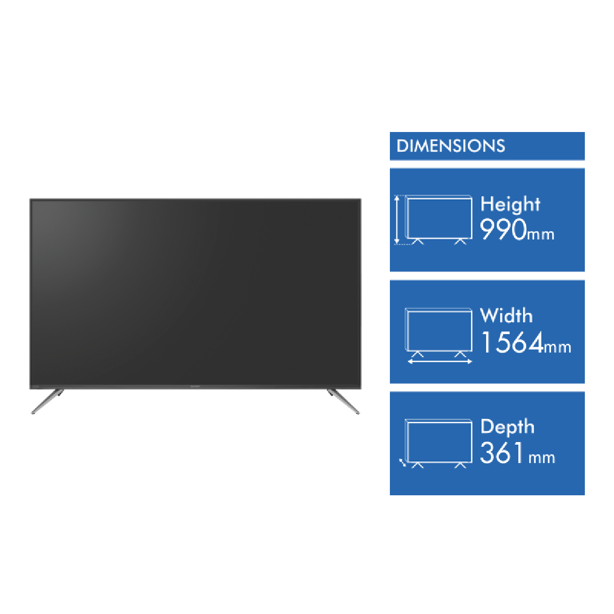 Immerse yourself in captivating 4K Ultra HD entertainment with the Sharp 70 Android TV. This LED smart TV delivers an expansive 70 display with stunning 7680 x 4320 resolution that reveals even the finest details in movies shows and games. Its wide 16:9 aspect ratio provides a cinematic viewing experience that fills your field of vision. Equipped with a quad-core processor and Android smart platform you can access popular apps like Netflix YouTube and Prime Video directly through the TV. Just speak into the voice remote to find entertainment get answers and control devices around your home through the built-in Google Assistant. With HDR10 support this TV optimizes contrast and color to make images pop. Hear all the action come to life through its stereo speakers. Connect up to four devices at once with its four HDMI inputs. Weighing just 34.5kg this slim LED TV can be wall mounted to maximize space. Its three-year warranty provides peace of mind. With brilliant clarity smart connectivity and an expansive 70 display the Sharp 70 Android TV delivers an immersive home entertainment experience. The manufacturer's part number for this product is 4T-C70DL1X. Experience it for yourself today.