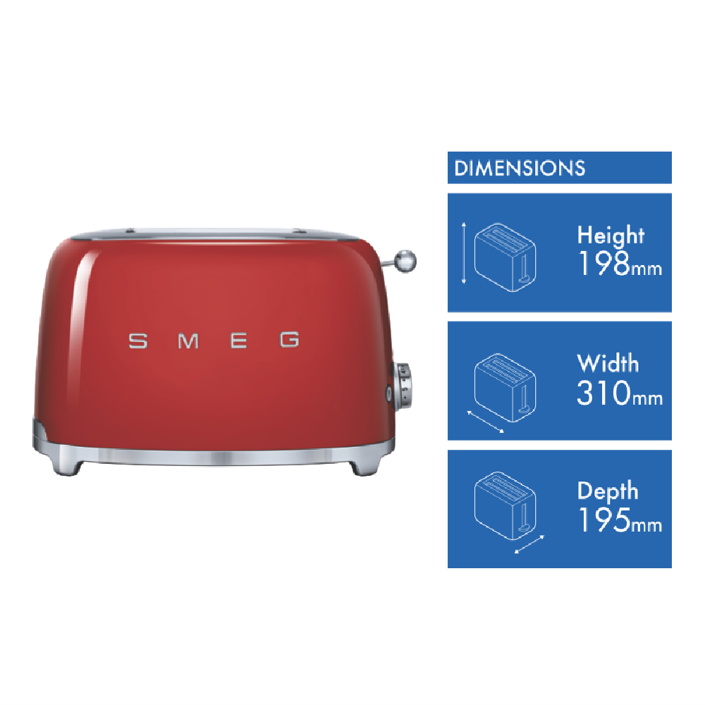 Capture the retro aesthetic in your kitchen with this timeless Smeg 50's Retro Style 2 Slice Toaster TSF01RDAU in red. Featuring the iconic Smeg 1950s silhouette with enamelled-coated stainless steel body and retro logo the award-winning Smeg toaster has six variable toasting levels and three pre-set programs - Defrost Reheat and Bagel - for ideal toasting each time. It features self-centring racks for even browning as well as a removable stainless steel crumb tray for easy cleaning. Get toast browned your way with the browning level adjustment function. It has anti-slip feet and built-in cord storage. Complete with an LED-backlit stylish control knob and stainless steel lever this Smeg retro toaster is the perfect companion to the Smeg 50's Retro Style Kettle for classic statement pieces you'd happily want to be seen.