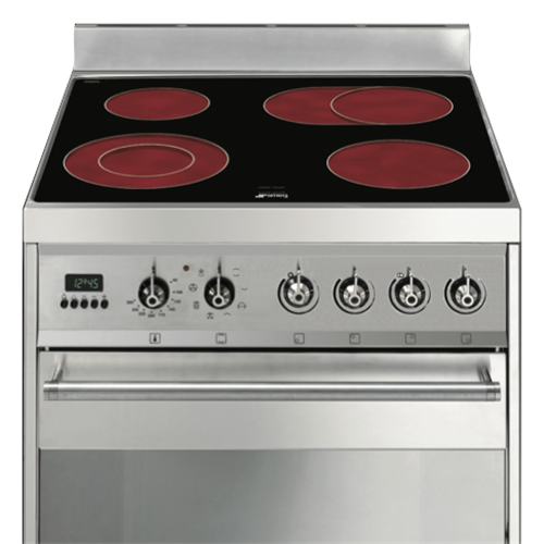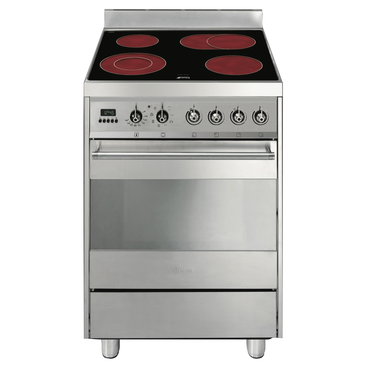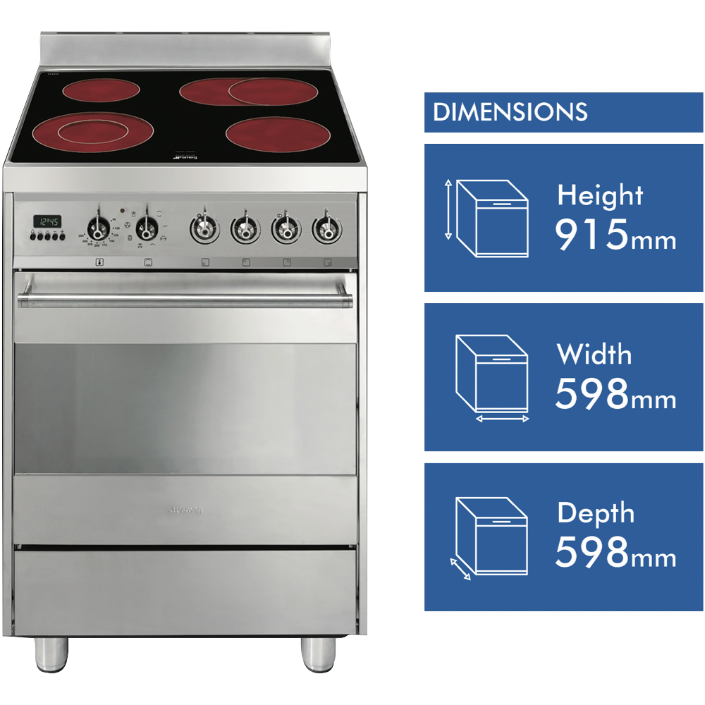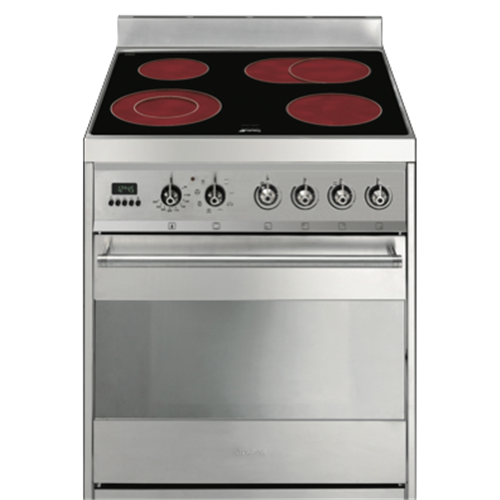 This Smeg upright cooker has an electric powered oven and a ceramic cooktop. Boil water quickly with its 4 burners. The Smeg C6CMXA8's 9 cooking functions let you explore a number of cooking options. It features a 598mm width a 915mm height and a 598mm depth. The Smeg upright cooker features a stainless steel finish and a 79 litre capacity. Easily transfer dishes from stove-top to oven with help from this Smeg upright cooker.