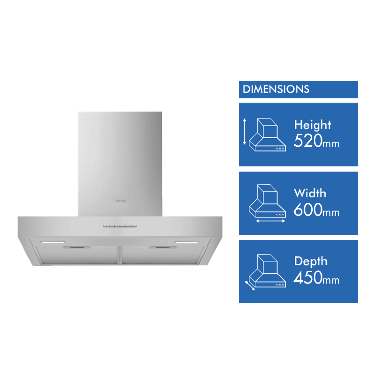 Bring sleek modern style to your kitchen with the Smeg 60cm Wallmount T-Shape Rangehood. This stainless steel canopy rangehood makes a striking design statement while efficiently removing steam grease and odours. With a powerful 230W motor and three fan speeds plus intensive mode this rangehood offers extraction capacities up to 686 cubic metres per hour for fresh indoor air. The intuitive push button controls allow you to adjust the fan speed with ease. And the two aluminium grease filters trap grease particles to keep your kitchen clean. At just 520mm high x 600mm wide this compact yet powerful rangehood mounts conveniently to the wall. Ducting is required to vent outdoors or the rangehood can recirculate air through an optional charcoal filter for filtration. With a noise rating of 49 to 72 decibels operation is quiet. Backed by a 2 year manufacturer's warranty the Smeg 60cm Wallmount T-Shape Rangehood combines performance with timeless style. The manufacturer's part number for this product is KBTAU600XE. Bring clean fresh air to your cooking space with this stylish and effective rangehood.