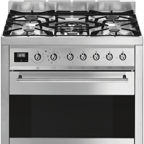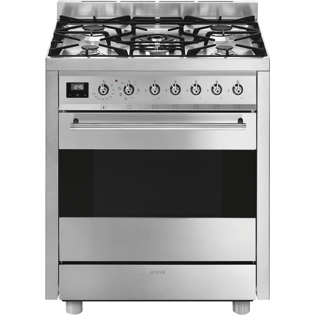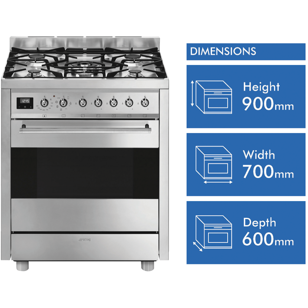 Bring home the ultimate cooking experience with the Smeg 70cm Dual Fuel Upright Cooker. This stainless steel freestanding oven adds a touch of retro style to your kitchen while providing exceptional functionality. With a spacious 79 litre capacity you can cook for the whole family. The gas cooktop features 5 burners to accommodate multiple pots and pans simultaneously. The fully programmable display and 8 oven functions including fan forced bakers function and convection baking provide exceptional versatility. Cook everything from perfectly crisp pizzas to moist cakes with ease. The triple glazed oven door keeps the heat inside for energy efficient cooking. With flame failure protection on each burner and a 2 year manufacturer's warranty you can trust this cooker to deliver performance and safety. This dual fuel upright cooker will be the stylish multifunctional centerpiece of your kitchen. Bring home delicious dinners and memorable moments with family and friends. The manufacturer's part number for this product is CS7GMXA. Consider the Smeg 70cm Dual Fuel Upright Cooker for your home.