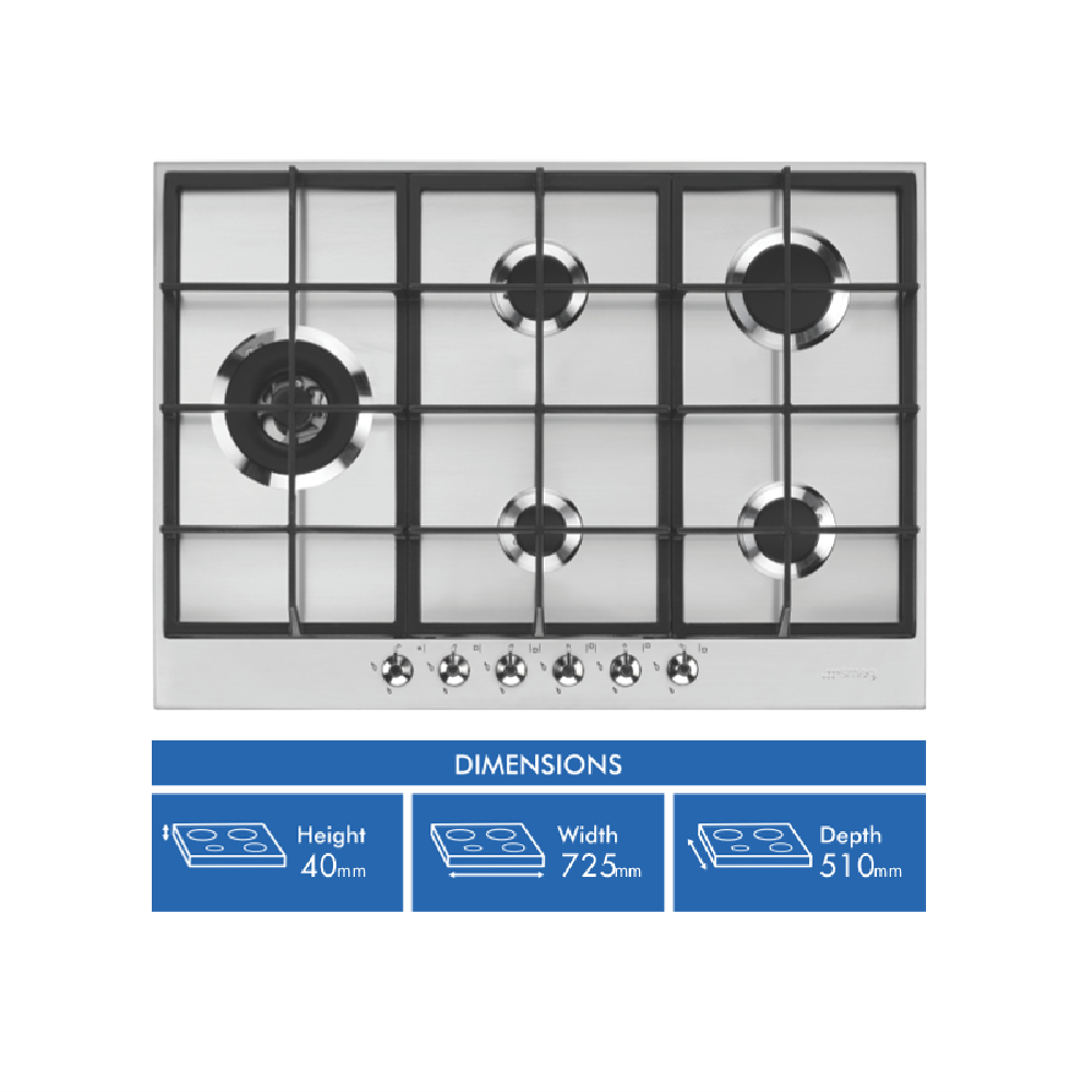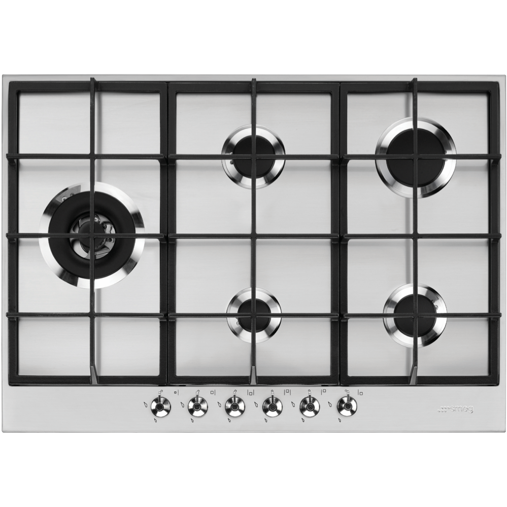 Bring restaurant-quality cooking into your home with the powerful yet stylish Smeg 72cm Classic Gas Cooktop. This 5-burner stainless steel cooktop provides the versatility to prepare a wide range of cuisines with features like an ultra rapid triple-ring wok burner flame failure safety device and electronic ignitions for reliable performance. The durable cast iron trivets and sleek stainless steel finish add elegance to your kitchen. With knob controls and automatic ignition this user-friendly cooktop makes cooking simple. The wok burner reaches extremely high temperatures to sear and stir fry while the other burners range from high to low for optimal heat control when simmering sauces or keeping food warm. Designed and manufactured in Italy this quality gas cooktop will be the centerpiece of your kitchen for years to come. The manufacturer's part number for this product is PX375LAU. Bring home restaurant inspiration with the Smeg Classic Gas Cooktop today.