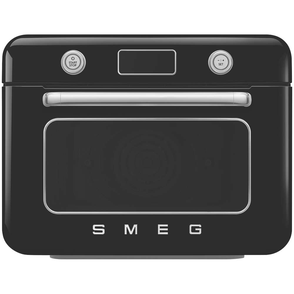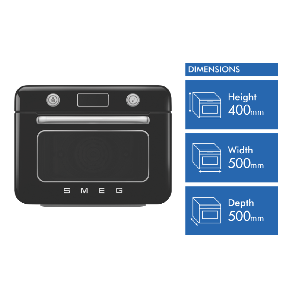 Smeg's benchtop combi steam oven brings versatility to your kitchen in a sleek black design. With 30 litres of capacity and 1800 watts of power you can cook bake grill steam and even air fry your favourite dishes. Choose from 4 traditional cooking functions 3 steam assisted modes plus handy extras like defrost and keep warm. The automatic recipes make meal prep a breeze while the easy-to-read colour LCD display puts you in control. Cleaning up is simple too thanks to the vapour clean function. Model COF01BLAU comes with a 2 year warranty for added peace of mind.