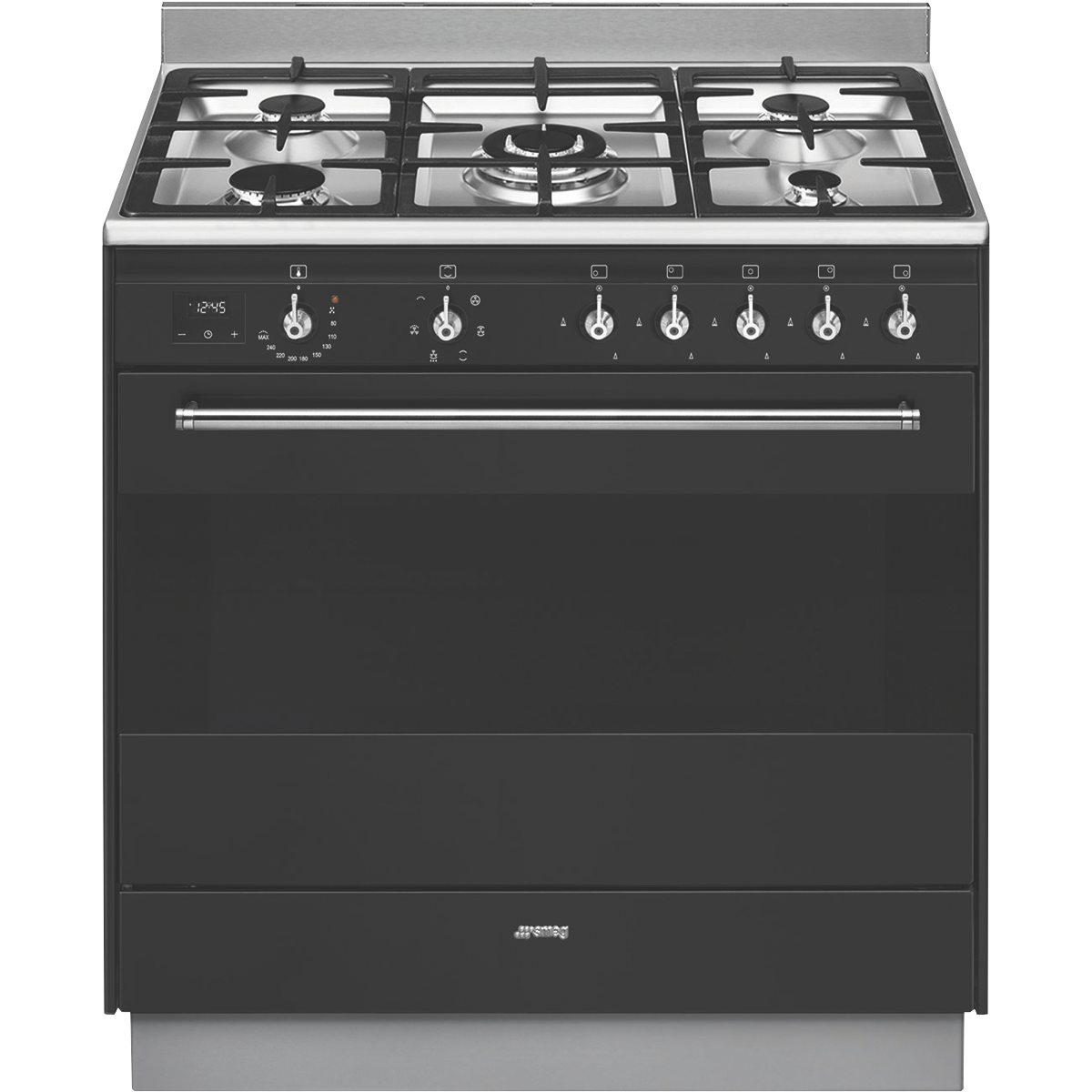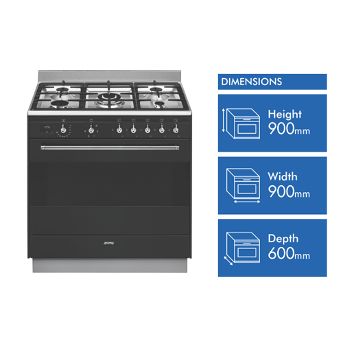 Discover the ultimate cooking experience with the Smeg 90cm Dual Fuel Upright Cooker Anthracite. This freestanding oven provides the perfect blend of style and functionality for any home chef. With a generous 115L net capacity seven versatile oven functions and a powerful five burner gas cooktop you'll have all the space and power needed to prepare delicious family meals. The spacious anthracite oven comes equipped with bakers convection fan assisted fan forced fan grill grill and vapour clean functions giving you the flexibility to bake roast or broil with ease. Dual halogen lights illuminate the interior so you can keep an eye on each dish. Meanwhile the gas cooktop features a flame failure safety device on each burner. With 90cm width this freestanding dual fuel cooker will be the stylish focal point of your kitchen. With triple glazed doors 50-260°C thermostat control and thermal protection the Smeg upright cooker provides reliable performance. It also includes accessories like chrome shelves grill inserts and enamel trays to help you make the most of the generous capacity. Bring gourmet cooking prowess to your home with this versatile anthracite dual fuel cooker. The manufacturer's part number for this product is FS9606AS-1. See how it can assist your culinary creativity today.