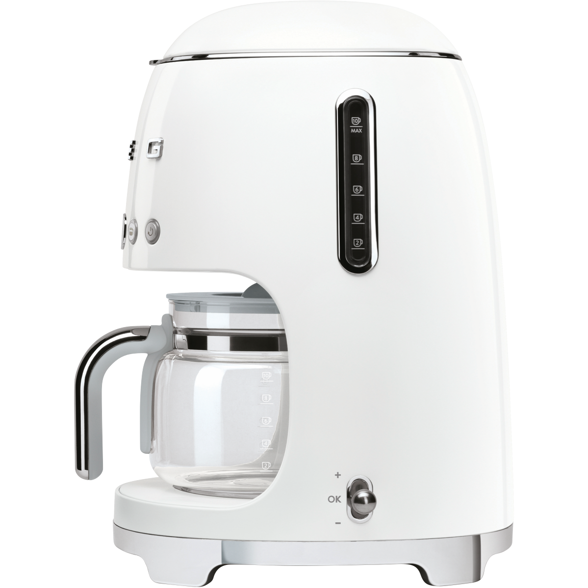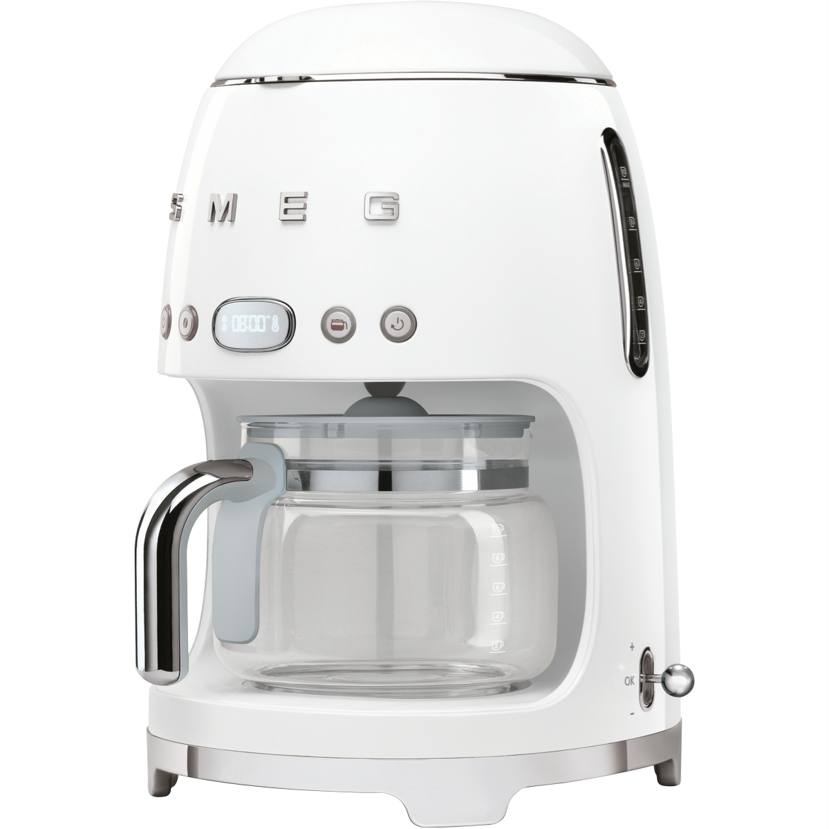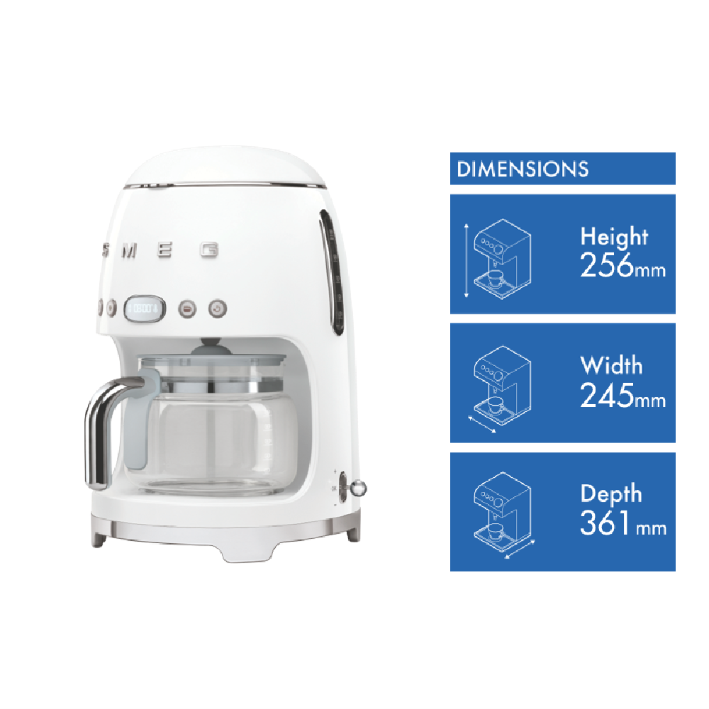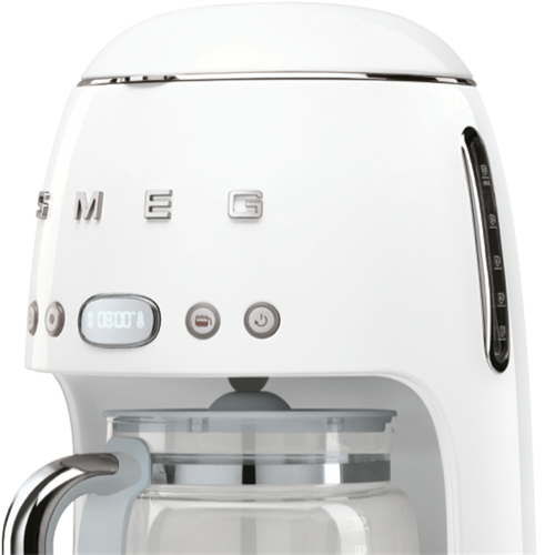 Bring the charm of a retro diner into your kitchen with the Smeg Retro Drip Filter Coffee Machine in crisp white. This stylish coffee machine brews up to 10 cups of aromatic coffee with its large 1.4L water tank. The easy 4 button operation and digital LED display with clock ensure fuss-free brewing every morning. Customise the strength of your coffee with the aroma intensity selector. The keep warm function keeps your coffee hot after brewing while the auto start mode lets you wake up to a freshly brewed pot. With a retro inspired curved design and polished chrome accents this coffee machine adds a touch of nostalgia to your countertop. The manufacturer's part number for this product is DCF02WHAU. Discover the joy of great tasting drip coffee made simple with Smeg.
