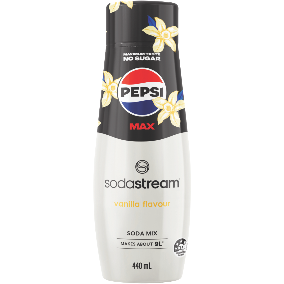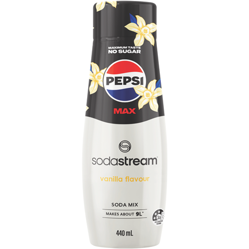 Add a burst of great taste to your sparkling water and create your own delicious Pepsi Max vanilla soda at home with the Sodastream Pepsi Max Vanilla Flavour Mix. This 440ml syrup combines the refreshing crisp taste of Pepsi Max with the sweet flavour of vanilla to provide a fizzy beverage that will satisfy your cravings. With the convenience of the Sodastream system you can customise the strength of the flavours and carbonation to suit your preferences. Simply add as many bubbles as you want to make a soft drink bursting with smooth vanilla notes and Pepsi's signature flavours. Enjoy chilled straight up or get creative and use it as a mixer for cocktails. The possibilities are endless with this syrup that will upgrade your Sodastream to a soda bar right at home. With Pepsi's great tasting formula now available for Sodastream you can stop paying premium prices for pre-made sodas and instead create your own for a fraction of the cost. This 440ml bottle provides 14 servings so you can keep the whole family refreshed. The manufacturer part number for this product is 1924228610. Start making your own bubbly vanilla Pepsi drinks today.