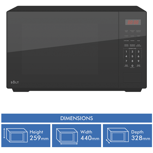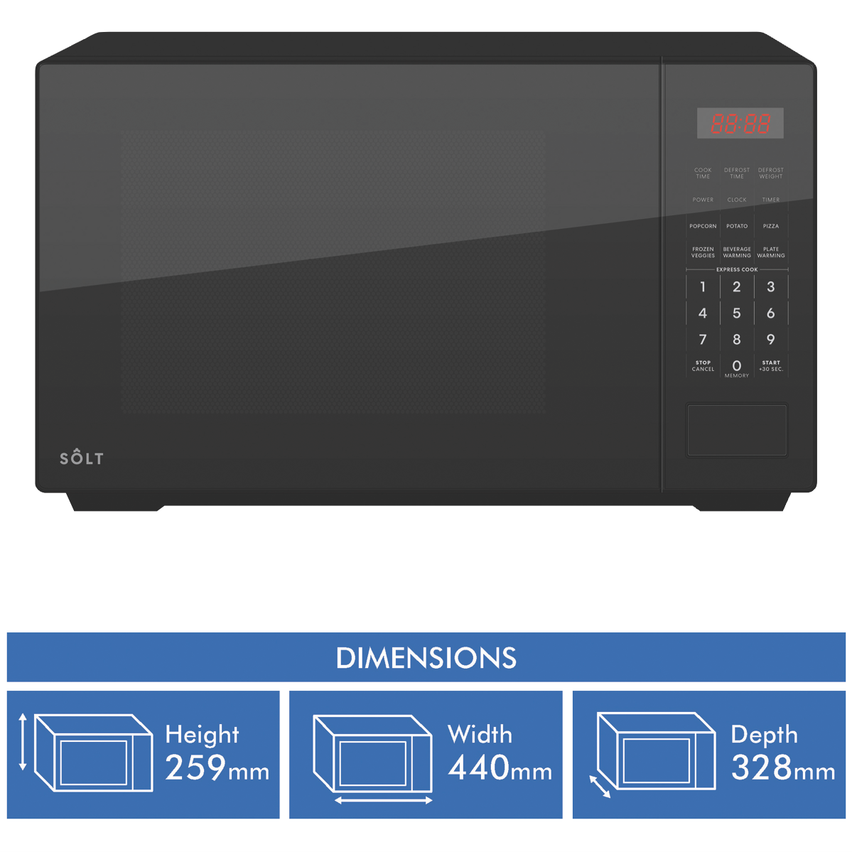 Enjoy faster cooking and more kitchen space with the Solt 20L 700W Microwave in sleek black. This conventional microwave oven boasts a generous 20 litre capacity and 11 power levels allowing you to quickly and conveniently prepare everything from frozen meals to steaming vegetables. The 700 watt output delivers powerful performance while the 44cm compact width lets you maximise your countertop real estate. With a 255mm turntable and interior LED lighting foods heat evenly and you can monitor cooking progress. Program cooking times with ease thanks to the handy digital display and control panel. Whether reheating leftovers or defrosting ingredients this microwave by Solt makes meal prep simple. The durable black finish resists fingerprints and blends seamlessly into any modern kitchen aesthetic. The manufacturer's part number for this product is GGSOMW20B. For convenient everyday use look no further than the Solt 20L 700W Microwave.