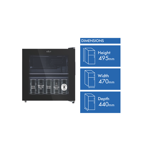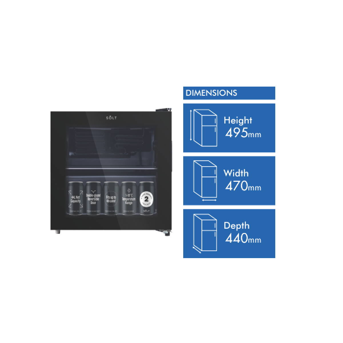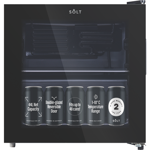 Keep beverages perfectly chilled for any occasion with the Solt 44L Beverage Chiller. This sleek black glass bar fridge comes equipped with a generous 44 litre capacity providing ample space for up to 48 canned drinks. The adjustable temperature range of 1°C to 10°C allows you to find the ideal chilling temperature while the reversible double glazed glass door and black finish add a touch of modern style to your space. With its energy efficient 3.5 star rating this fridge will keep your beverages cold without driving up electricity bills. The glass shelf provides sturdy storage and the adjustable foot and recessed door handle allow for a flush fit in your cabinetry or entertainment unit. For added convenience the door is reversible so you can set it up to open left or right. Bring simple refreshment to your home with the Solt 44L Beverage Chiller. The manufacturer's part number for this product is GGSBC44B. Check out this bar fridge today and keep drinks perfectly chilled for any gathering.