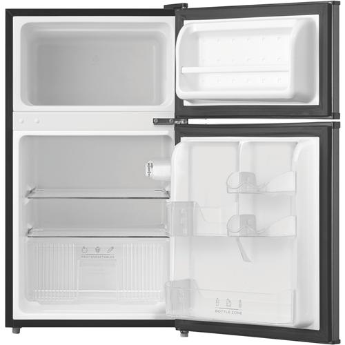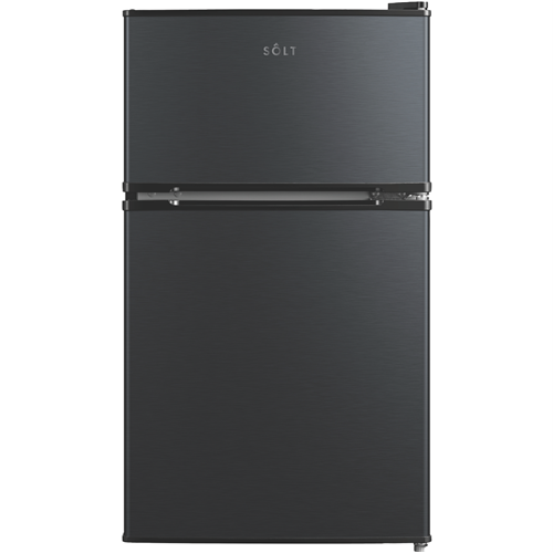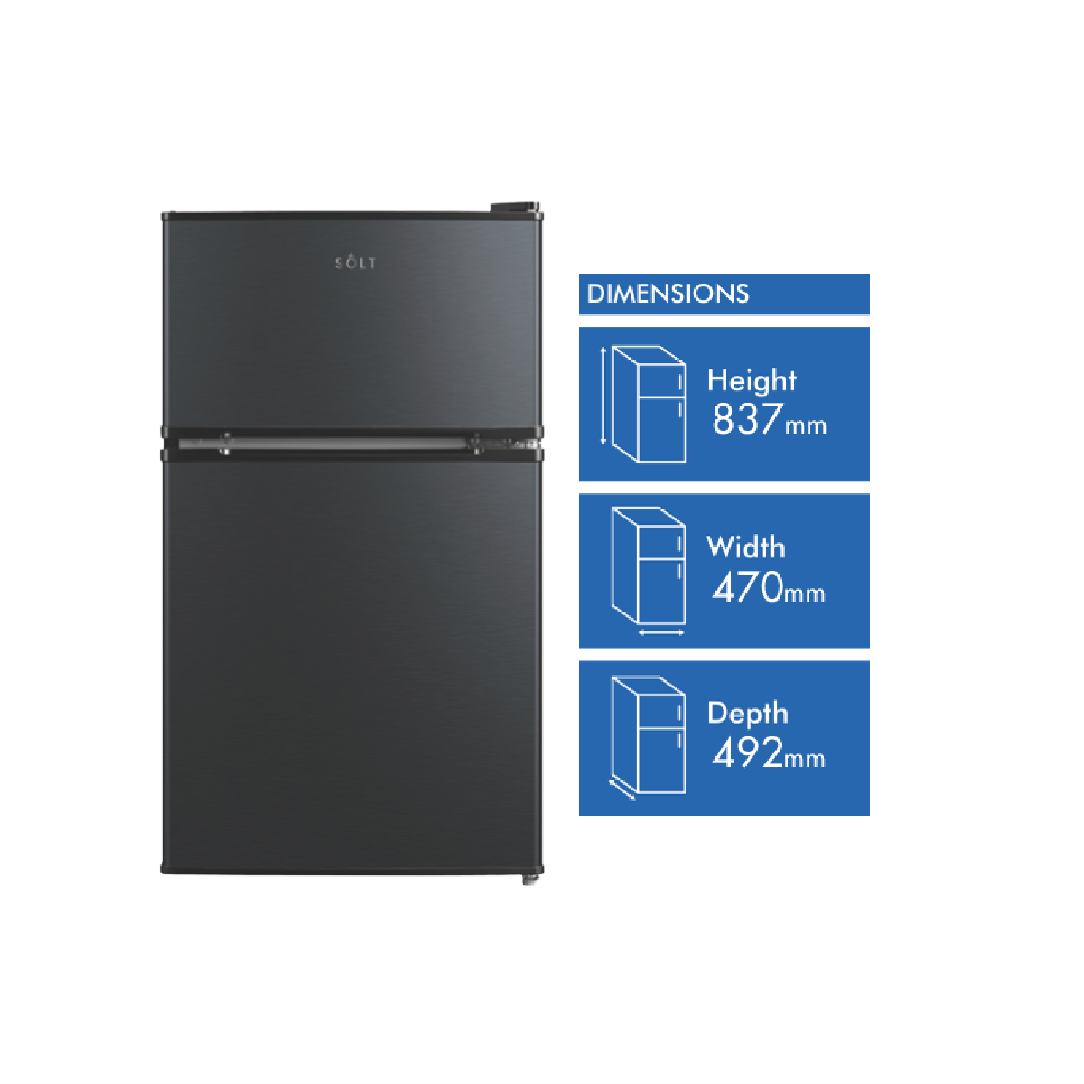 With its sleek black finish and compact design this 87L Solt bar fridge is the perfect addition for any home bar or kitchen. The spacious 61L fridge capacity features two removable glass shelves and a crisper drawer to keep fruits and vegetables fresh while the 26L freezer has ample room for ice cubes and frozen treats. The adjustable thermostat lets you customize the temperature and the reversible door with durable exterior can open from either side to suit your space. Enjoy the convenience of 5 door storage trays for cans condiments and more. And when it's time to clean up the recessed handles provide a seamless look. Backed by a 2 year manufacturer's warranty the Solt 87L bar fridge with Manufacturer Part Number GGSBF91DS is a reliable choice.