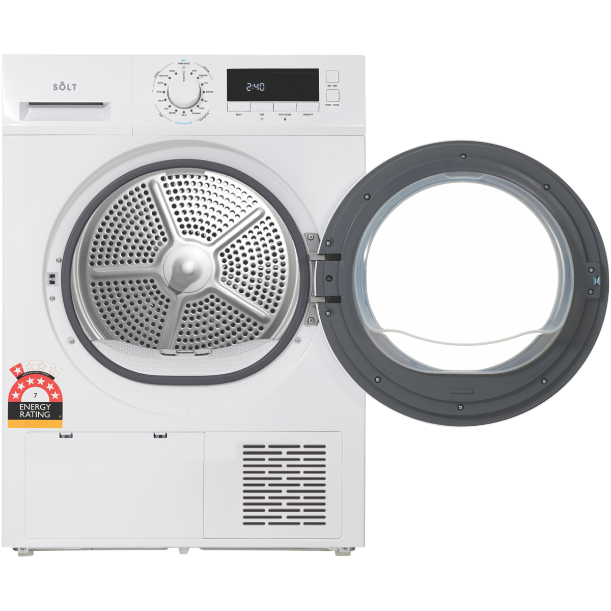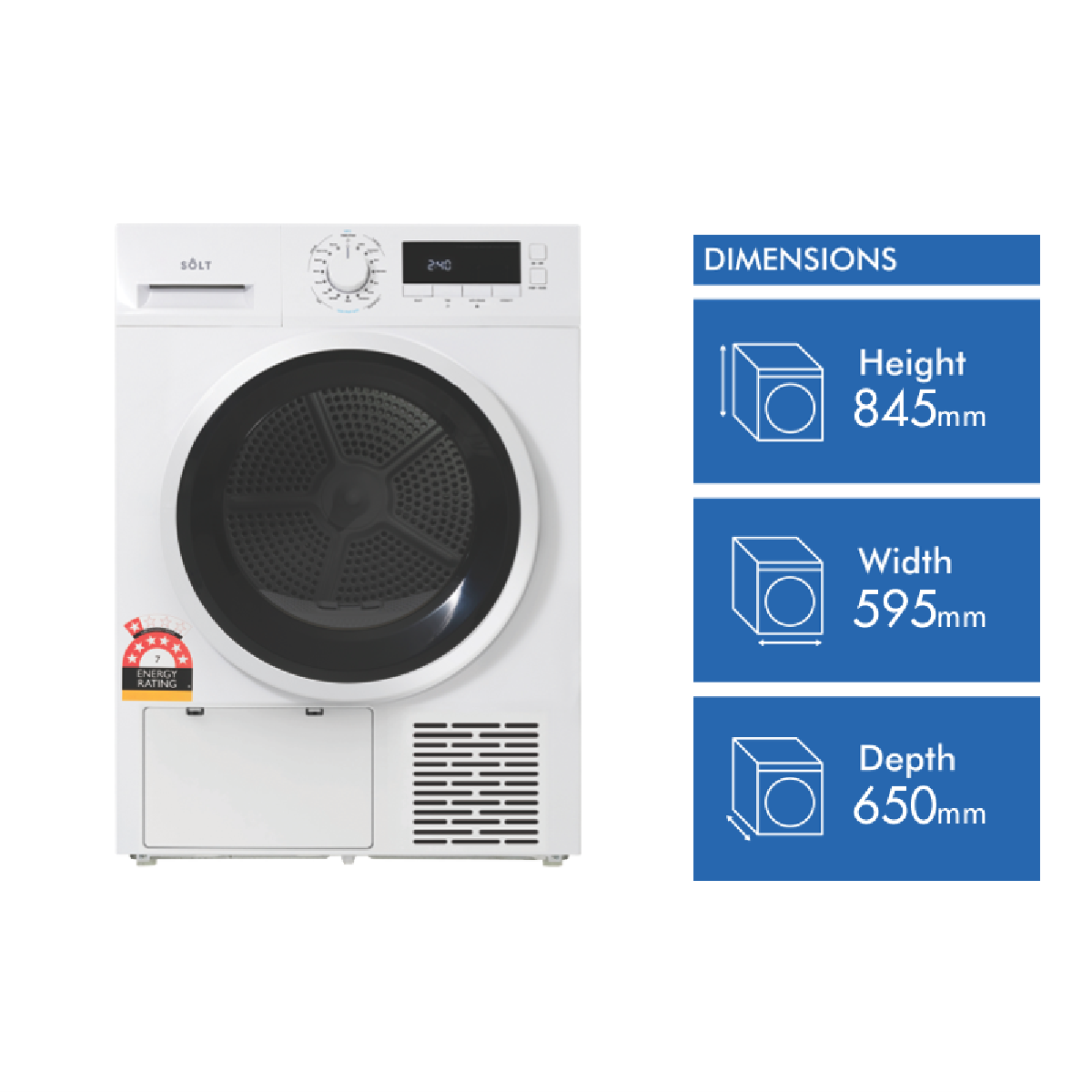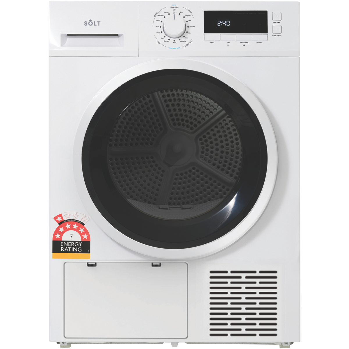 Discover a life-changing laundry experience with the Solt 8kg Heat Pump Dryer. This innovative 7 star energy rated clothes dryer is designed to be gentle on fabrics while maximizing energy efficiency. With its generous 8kg drying capacity you can refresh even the largest of loads with ease. The advanced heat pump technology draws moisture away from clothes without relying solely on heat protecting fabrics from over-drying. Choose from 16 specialized drying programs like Cotton Synthetic Wool and Sports wear to customize cycles for any garment type. Additional features such as the 24 hour delay start option anti-crease function and reverse tumbling showcase the thoughtfulness put into this dryer. Installation is simplified with the ability to stack the 595mm wide x 845mm high x 650mm deep body on top of a washing machine. Bring exceptional fabric care and smart technology into your laundry room with the Solt 8kg Heat Pump Dryer today. The manufacturer's part number for this product is GGSHPD800W. Discover if this is the dryer for you by learning more now.
