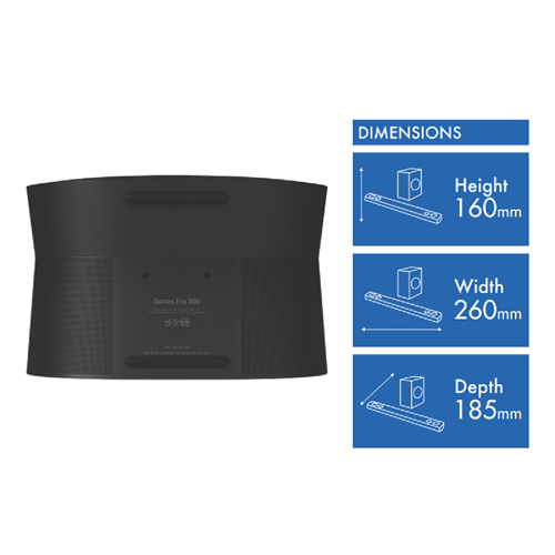 Step into superior sound with the Sonos Era 300. This sleek wireless speaker pumps out room-filling audio in true Sonos style blending modern aesthetics with smart connectivity for fuss-free streaming. With Bluetooth and Wi-Fi on board you can jam to your favourite playlists from any device. Control is a breeze with the Sonos app AirPlay 2 and built-in voice control with Amazon Alexa. Touch controls let you skip tracks or adjust volume right on the speaker. Slim and subtle the Era 300 makes an elegant statement on any shelf or tabletop thanks to its matte black finish and compact footprint measuring just 160mm high x 260mm wide x 185mm deep. The durable polycarbonate housing shrugs off moisture so you can enjoy stellar sound in the kitchen or bathroom worry-free. Inside you'll find custom-designed drivers and advanced processing that delivers clear balanced audio with plenty of detail and depth. This wireless speaker is optimised to fill rooms with immersive faithful sound that brings music movies and more to life. With modern styling and smart streaming in a durable compact form the Sonos Era 300 makes it easier than ever to enjoy brilliant sound anywhere at home. The manufacturer's part number for this product is E30G1AU1BLK. Learn more about the Sonos Era 300 online today.