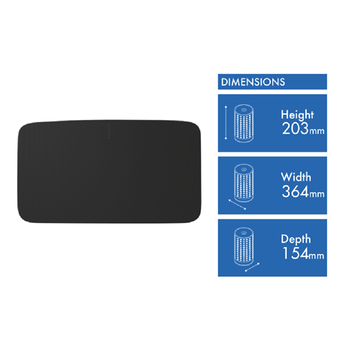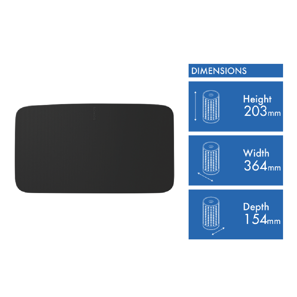 Bring the power of room-filling sound home with the Sonos Five wireless speaker. With two force-cancelling woofers and three dedicated amplifiers this sleek black speaker delivers clear rich audio and deep bass you can feel. Stream all your favourite music radio podcasts and more over Wi-Fi in stunning high fidelity. Control it all easily with the Sonos app Apple AirPlay 2 and your voice with Amazon Alexa and Google Assistant built right in. Place the Sonos Five anywhere - its compact design fits seamlessly into any living space. Connect wirelessly over Wi-Fi 802.11a/b/g/n 2.4 or 5 GHz to a broadcast-capable router. Or use the auxiliary input to connect a separate audio device via cable. This latest addition to the renowned Sonos family comes with everything you need to start listening including power cable quick start guide and legal/warranty information. Covered by a 1 year manufacturer's warranty.With its minimalist look brilliant sound and smart connectivity the Sonos Five wireless speaker makes it simple to fill your home with music you love. Bring concert quality audio to every moment. The manufacturer's part number for this product is FIVE1AU1BLK. Learn more about the Sonos Five and bring your music to life.