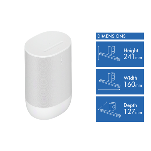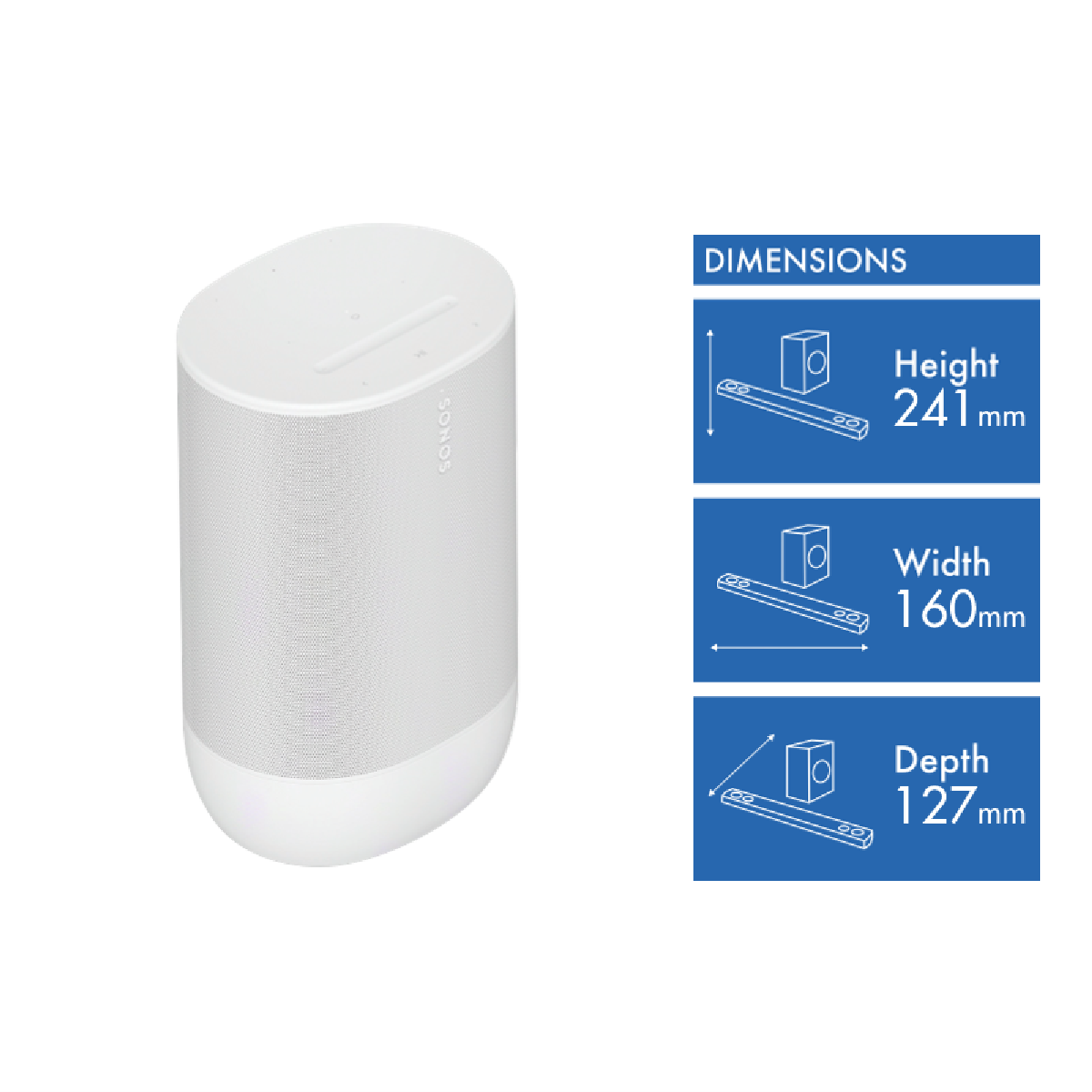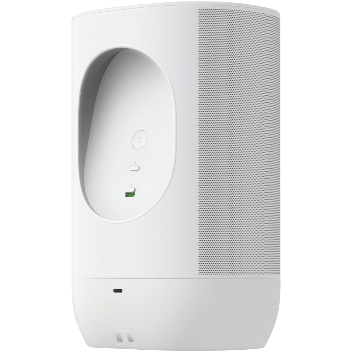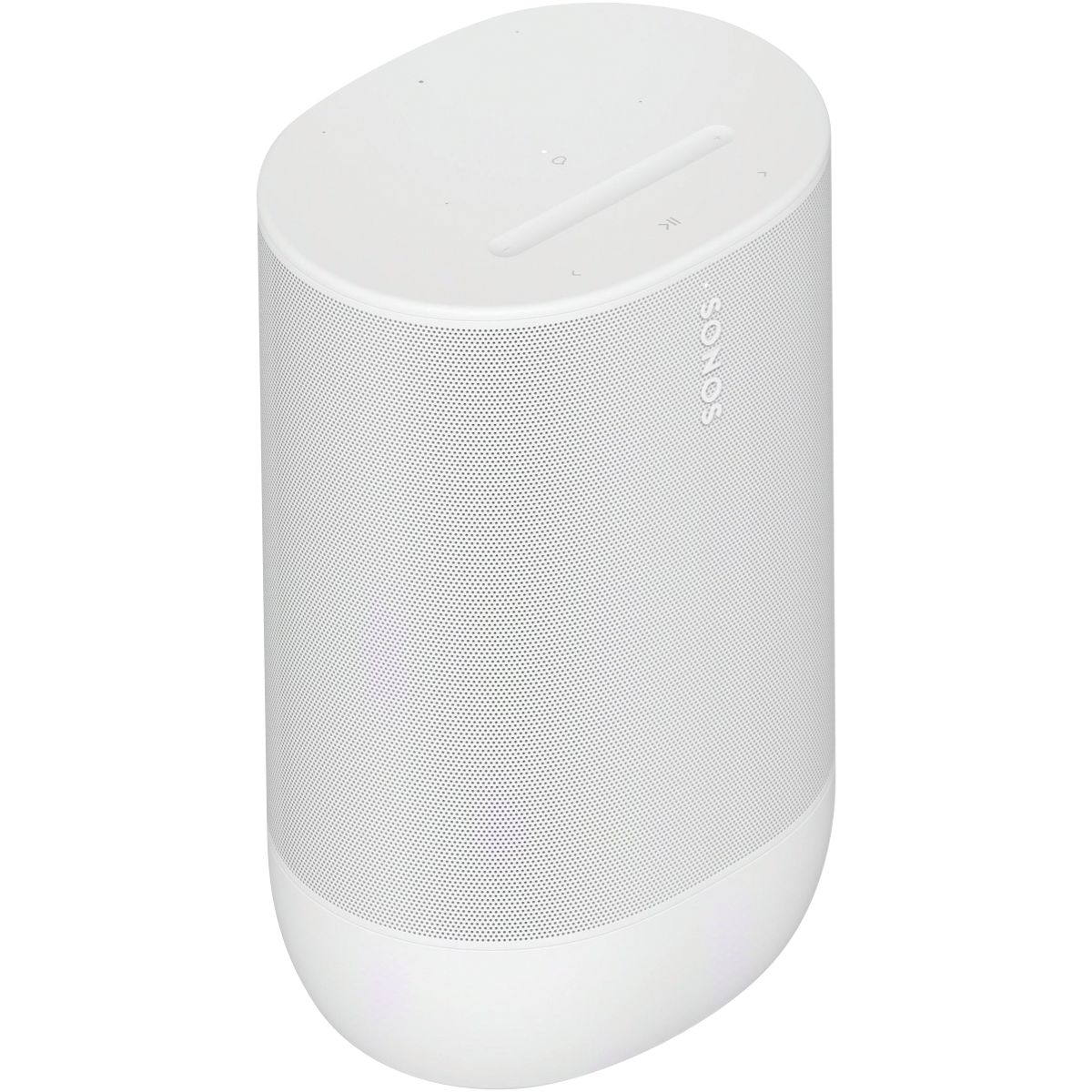 Take your music anywhere with the Sonos Move 2 portable smart speaker in sleek white. With Wi-Fi and Bluetooth connectivity you can stream all your favorite songs and podcasts at home or on the go. Despite its portable design the Sonos Move 2 delivers powerful room-filling sound with 45 watts of total output. It automatically tunes its sound profile to wherever you place it whether on a bookshelf or hanging outside on the patio. Control it with your voice using Alexa and listen to music through AirPlay 2 on Apple devices. With up to 11 hours of battery life weather resistance and easy recharging through the included base the Sonos Move 2 goes wherever life takes you. This versatile speaker lets you start a song in the living room and finish it in the backyard thanks to seamless integration with other Sonos speakers. The manufacturer's part number for this product is MOVE2AU1. Bring your music to life with the Sonos Move 2 portable speaker.