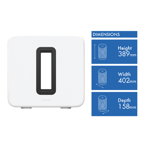 Immerse yourself in pure deep bass for your home audio system with the Sonos Sub Gen3 wireless subwoofer. This latest addition to the Sonos family delivers robust audio enhancement with no buzzing or distortion. Crafted in a sleek white design the Sub Gen3 connects wirelessly to your Sonos sound system using WiFi and 2.4GHz technology for cable-free convenience. Measuring 389mm high 402mm wide and 158mm deep the compact Sub Gen3 weighs 16kg for easy positioning. It works seamlessly with your favourite music services for bass-boosted streaming throughout your home. With a 1 year warranty from Sonos the Sub Gen3 wireless subwoofer is the perfect choice for powerful room-filling sound. Experience your music collection like never before when you add the Sonos Sub Gen3 to your home audio setup. The manufacturer's part number for this product is SUBG3AU1.