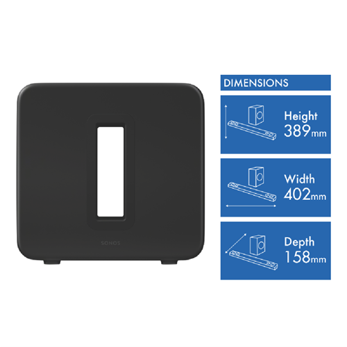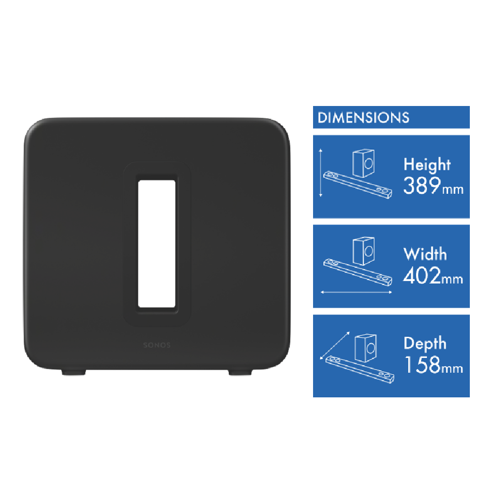 Sub 4 unlocks the full power of Sonos sound. Pair this subwoofer with your Sonos soundbar or speaker for pulse-pounding bass that immerses you deeper in movies TV and music. Dual force-canceling woofers virtually eliminate distortion. Even at loud volumes you won t experience any buzzing or rattling. Updated with a matte finish the iconic design is worthy of display in your home. Set it up in minutes just plug in the power cable and open the Sonos app. Sub 4 connects to your system over WiFi so you can put it where it looks and fits best in the room. Stand it upright or lay it on its side and hide it under your sofa. Pair two with Arc Ultra or Arc for bass so deep and sound so cinematic you ll forget you re not in an actual theater. Recommended for Arc Ultra Arc Beam Era 300 Five Amp