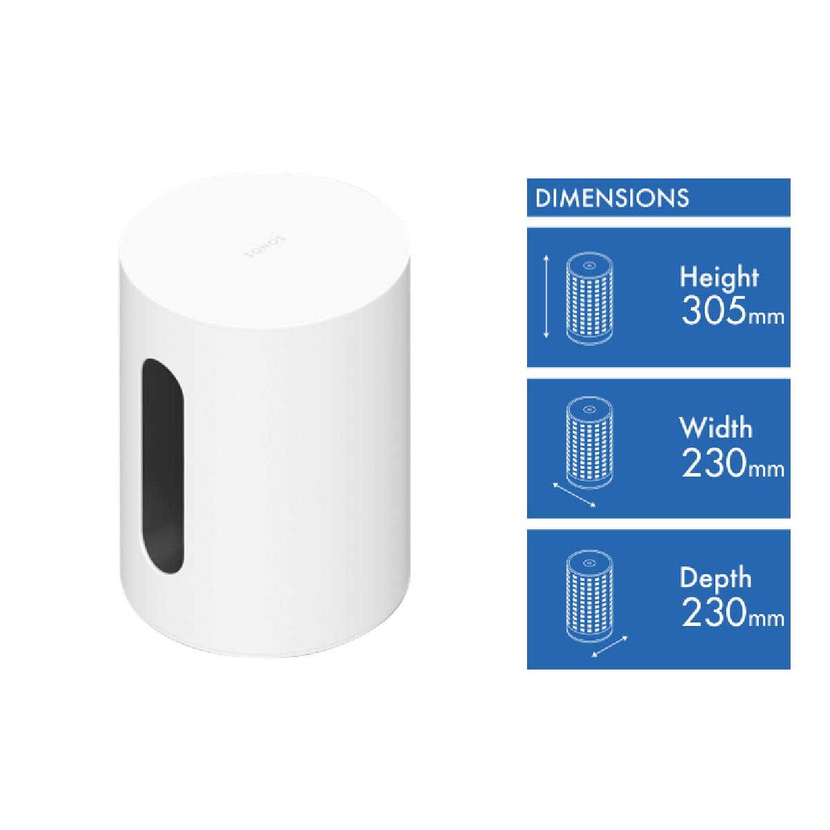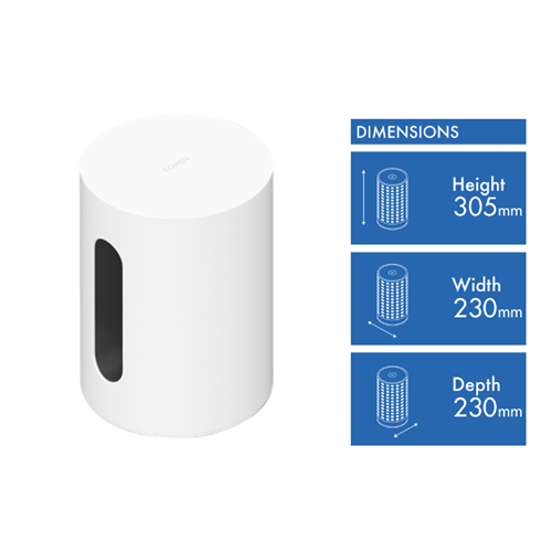 The Sonos (SUBM1AU1) Sub Mini in white is a wireless subwoofer recommended for use with the Sonos Beam Ray One One SL Amp. It features dual custom woofers that generate deep dynamic low end that makes you feel more immersed in every scene and song. It is also simple and easy to set up. Just plug in the power cable and open to the Sonos app to wirelessly connect Sub Mini to your sound bar or speaker.