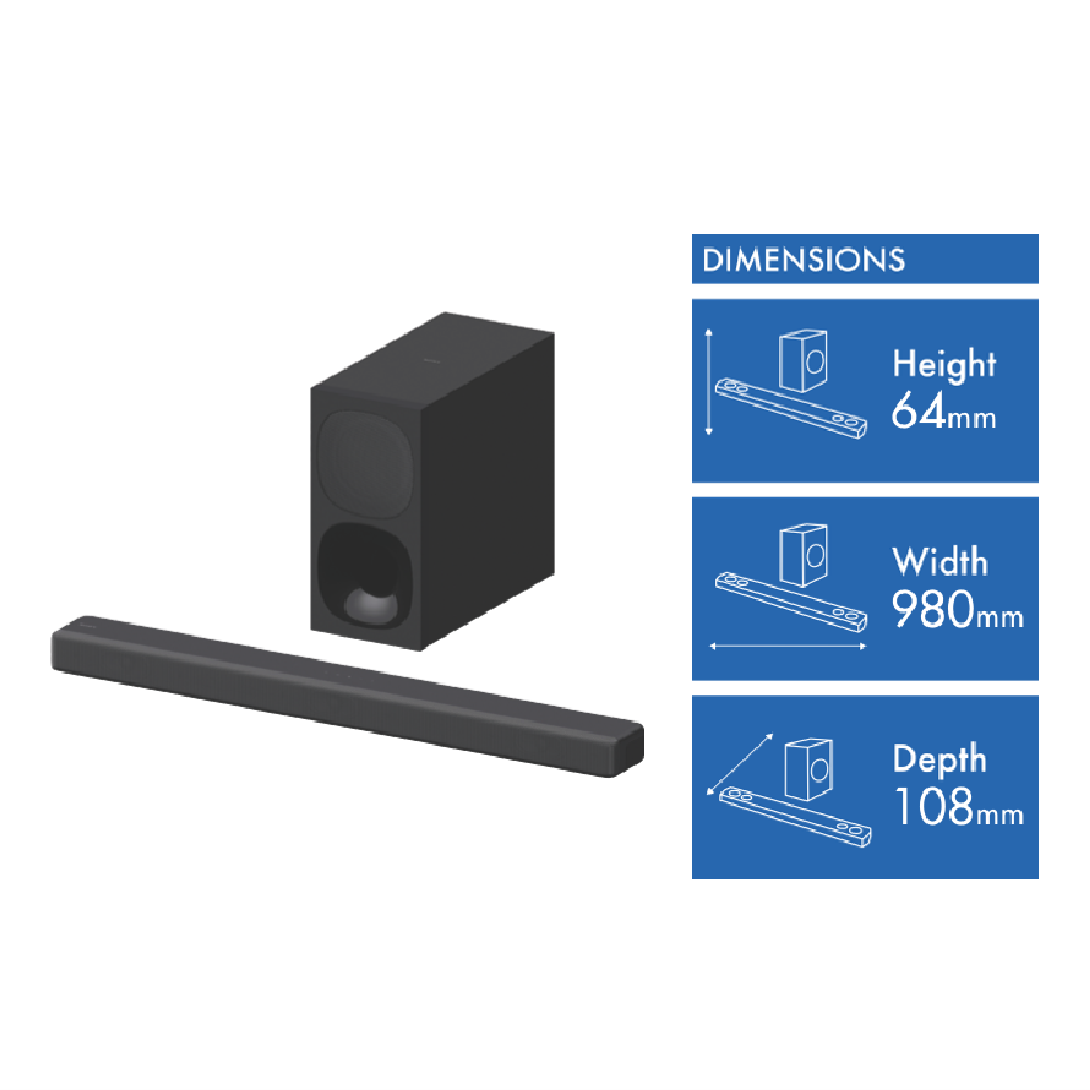 Immerse yourself in cinematic surround sound with the Sony HTG700 3.1ch Dolby Atmos 400W Soundbar. This sleek black soundbar packs an audio punch delivering room-filling audio with Dolby Atmos and DTS:X support for multidimensional sound. With 400W of total output power 3.1 channels and sound modes like Cinema and Music the HTG700 transforms your home entertainment experience. Connect via Wi-Fi Bluetooth or HDMI to stream all your favorite content. Additional features like Night Mode Voice Mode and HDR10 and Dolby Vision compatibility make this soundbar a versatile upgrade. Setup is a breeze with the included remote control batteries cables and manual. Weighing only 3.5kg the 980mm wide soundbar fits perfectly in front of your TV. Backed by Sony's 1 year warranty the HTG700 delivers powerful immersive audio for movies music and more. The manufacturer's part number for this product is HTG700. Take your home theater to the next level with the Sony 3.1ch Dolby Atmos 400W Soundbar.