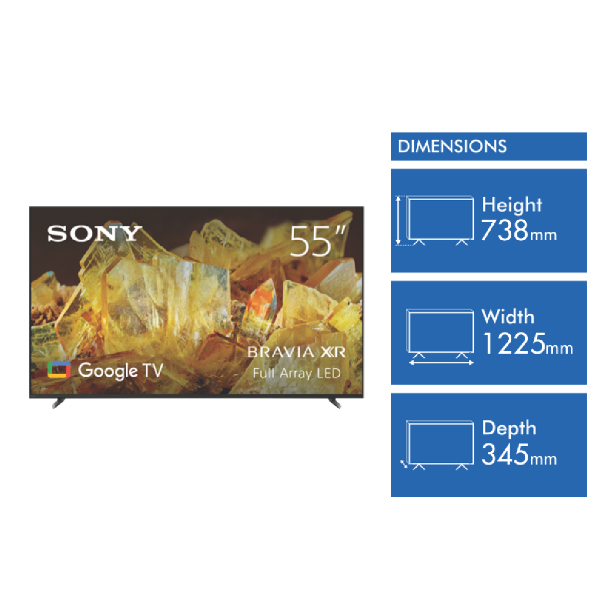 Immerse yourself in breathtaking 4K HDR entertainment with the Sony 55-inch X90L BRAVIA XR Full Array LED Google TV. This ultra high definition smart TV delivers vibrant true-to-life visuals and realistic sound thanks to innovative technologies like the cognitive processor XR XR Triluminos Pro and Dolby Atmos. With full array local dimming you'll enjoy incredible contrast between the darkest blacks and brightest whites. Powered by Google TV you'll have access to all your favorite apps and streaming services. Gaming is smooth and responsive with dedicated game mode. The sleek minimalist design looks great in any living room. Setup is simple with the included voice remote. Bring home the cinematic experience with the 55-inch Sony X90L LED TV. The manufacturer's part number for this product is XR55X90L. Find your new favorite 4K TV today.