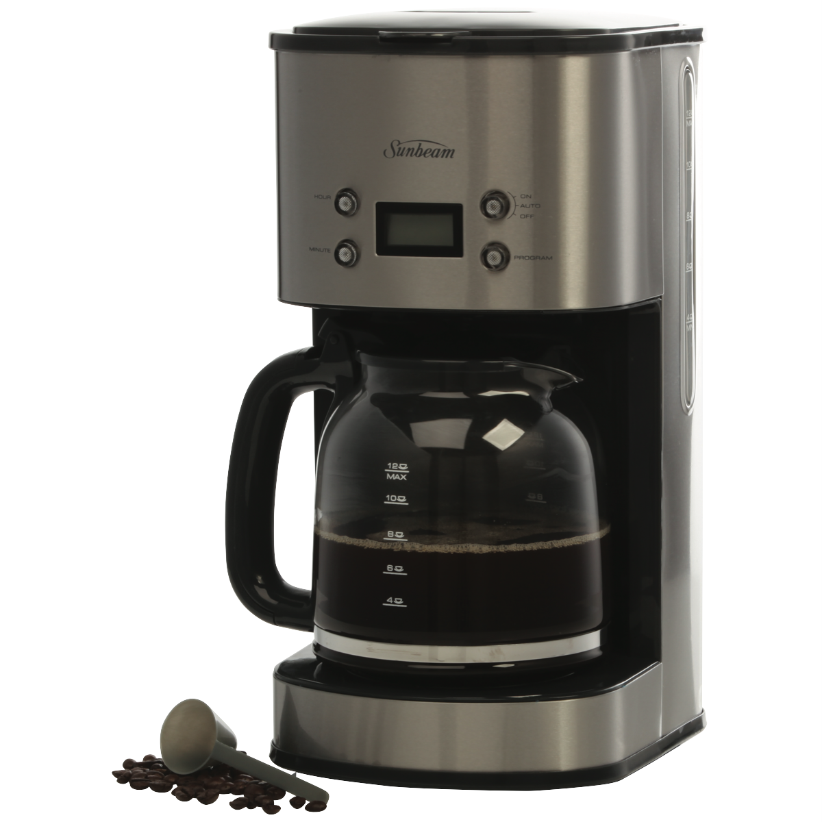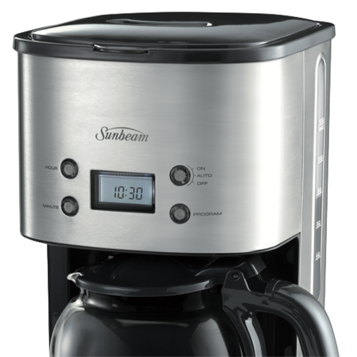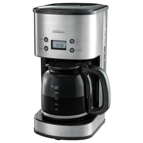Enjoy fresh delicious coffee every morning with the Sunbeam 12 Cup Drip Filter Coffee Machine. This stainless steel coffee maker brews up to 12 cups of coffee at a time perfect for gatherings with family and friends or keeping the whole office energized. The programmable timer allows you to wake up to the inviting aroma of freshly brewed coffee. Simply add water and ground coffee into the machine the night before set the timer and a hot pot will be ready when you wake. The shower head evenly distributes water over the coffee grounds for optimal flavor extraction. The keep warm plate ensures your coffee stays hot for up to 2 hours after brewing completes. The removable filter basket and glass carafe make cleanup quick and easy. Brew coffee just the way you like with the strength selector dial. This drip coffee machine's compact footprint saves precious counter space in your kitchen. Experience the convenience of hot tasty coffee anytime with the Sunbeam 12 Cup Drip Filter Coffee Machine. The manufacturer's part number for this product is PC7900. Check out this coffee maker to start your mornings right.