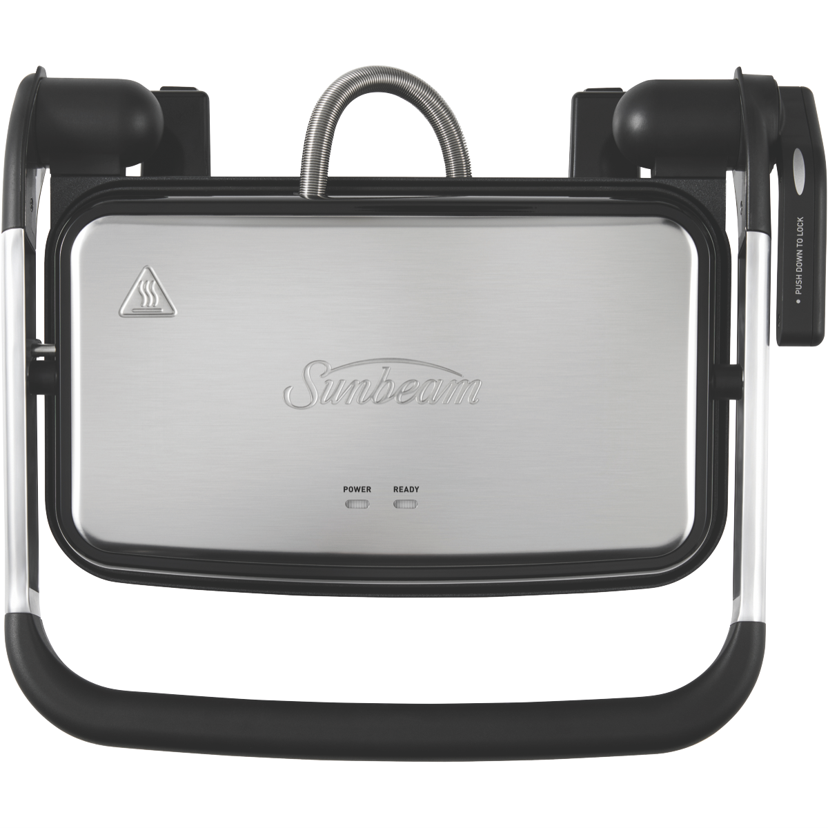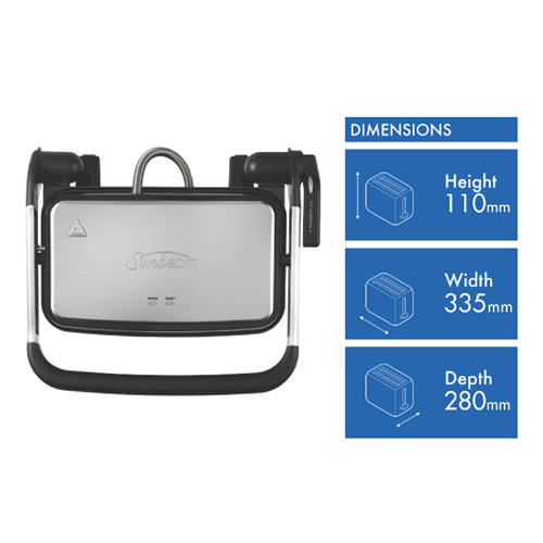 Make quick delicious sandwiches with the Sunbeam Cafe Style 2 Slice Sandwich Maker. This compact stainless steel appliance delivers tasty toasted sandwiches in minutes with its 1800 watt power. The easy-clean non-stick coating ensures effortless cleanup while the AnyHeight control lever lets you get the perfect level of crispness. With warm-up and ready indicator lights cool-touch handles built-in cord storage and a 2 year warranty this versatile sandwich press is ideal for students professionals and families who want fast convenient meals. The vertical storage design minimizes countertop clutter. Crafted with a curved lip for easy crumb removal this 2-slice sandwich maker by Sunbeam can handle everything from morning toast to dinner paninis. Enjoy cafe-style sandwiches without leaving home - the manufacturer's part number for this product is GRM2000SS. Seize the opportunity to own an efficient user-friendly sandwich maker that will upgrade your breakfast and lunch routine.