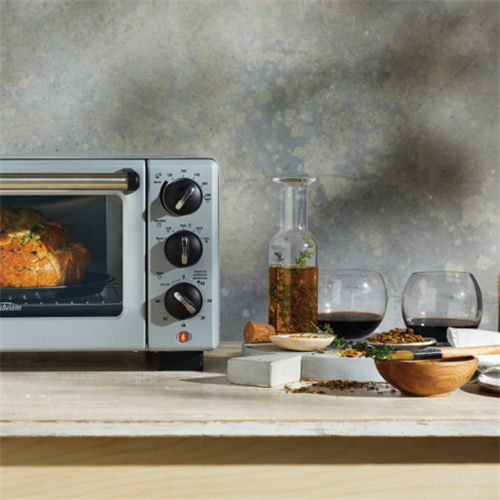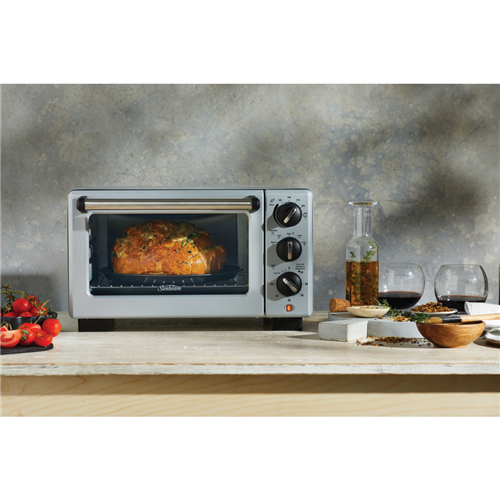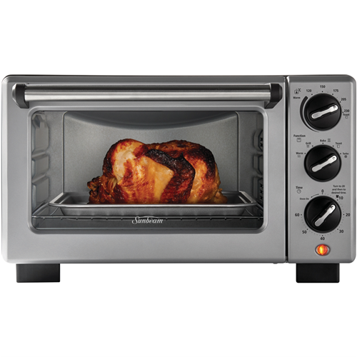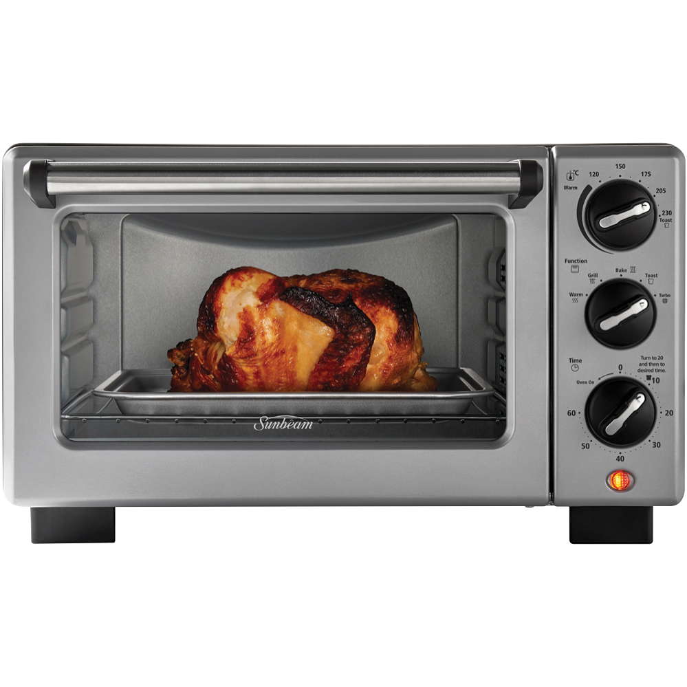 Bake grill and toast to perfection with the versatile Sunbeam Convection Bake & Grill Compact Oven. This metal-wrapped compact oven offers 18 litres of cooking space and 1400 watts of power to quickly and evenly prepare everything from pizza to roast chicken. Independent dial controls allow you to easily set the temperature cooking mode and 60-minute timer. Turbo convection technology circulates hot air for fast even cooking results. The adjustable wire rack and multiple accessories like the pizza tray and baking pan provide flexibility. Grill juicy burgers crisp up fries or bake cakes cookies and more. With settings for baking grilling warming and toasting this is the ideal countertop oven for small spaces. The manufacturer's part number for this product is COM3500SS. Discover how convenient cooking can be with the Sunbeam Convection Oven.
