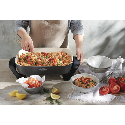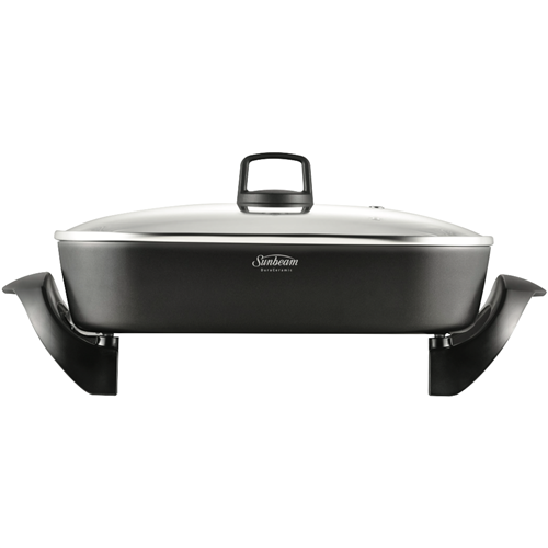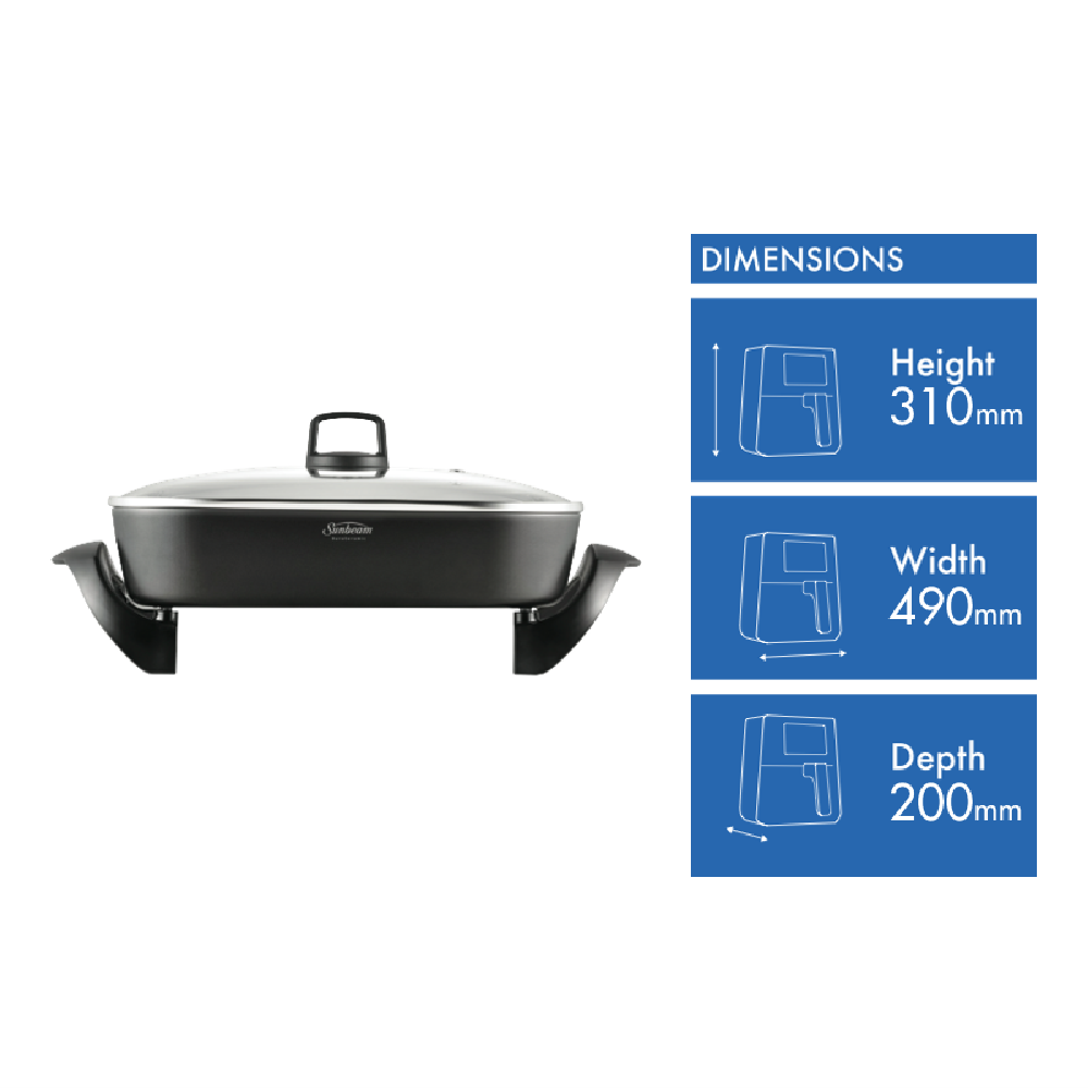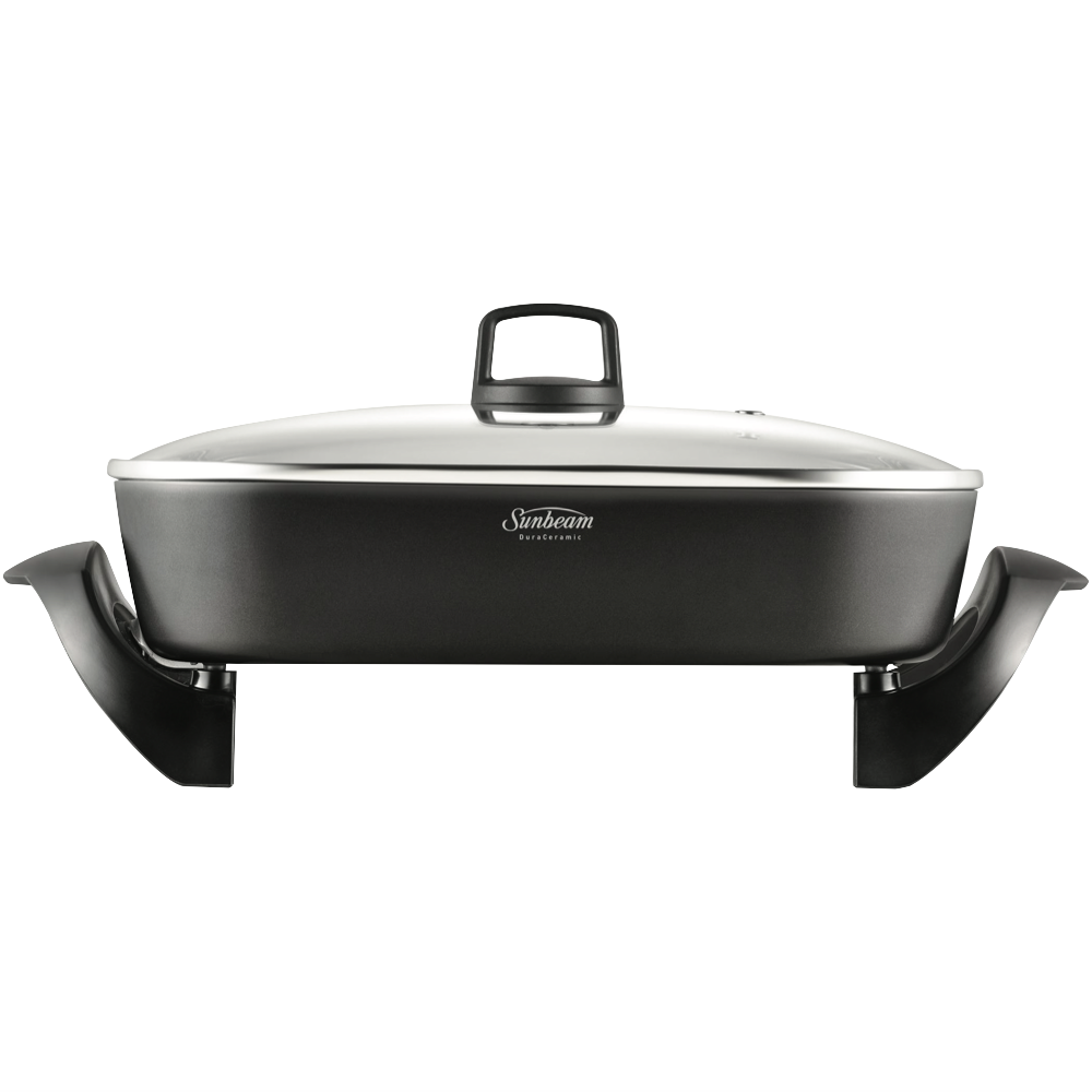 Add a touch of elegance to your kitchen with the Sunbeam Duraceramic Charcoal Frypan. This stylish frypan features a durable ceramic coating that provides even heat distribution and easy food release for outstanding cooking results. With a generous 490mm width you'll have plenty of room to cook everything from pancakes to stir fries. The 5.1kg lightweight design also makes it easy to maneuver. Use this frypan to sear meats sauté veggies or fry eggs without worrying about food sticking. The smooth ceramic surface cleans up easily when you're done cooking. Rely on this frypan's superior nonstick ability and enjoy effortless cooking and cleaning for years to come. At 310mm high and 200mm deep it will fit perfectly on your stovetop. Sunbeam stands behind the quality of this frypan with a 1 year warranty. The manufacturer's part number for this product is FP6000. For delicious meals and easy cleanup bring home the Sunbeam Duraceramic Charcoal Frypan.