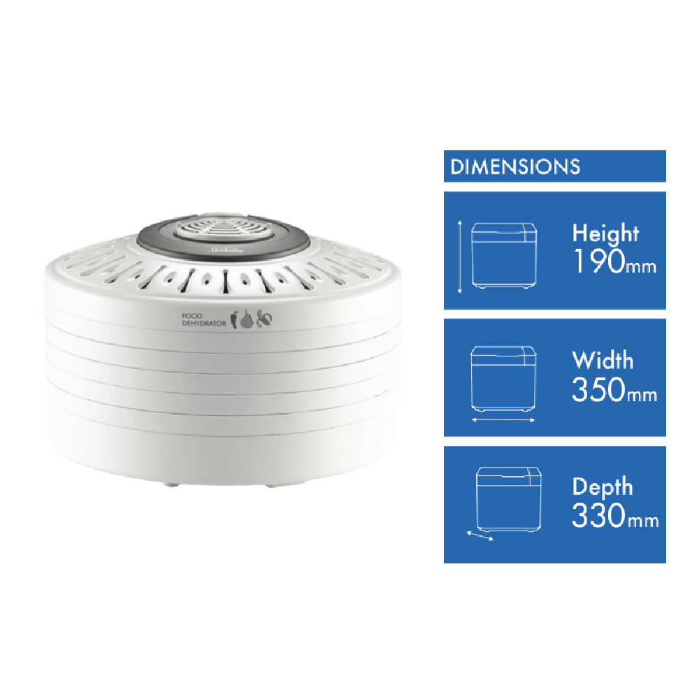 Transform your home cooking and unlock healthier living with the Sunbeam Food Dehydrator DT5600. This versatile kitchen appliance enables you to create delicious dried fruits vegetables jerky crackers breads herbs and more using its 3 adjustable heat settings and 5 spacious drying racks offering 370 watts of drying power. The included fruit roll tray accessory lets you make fruit leathers and roll-ups easily. Measuring 190mm H x 350mm W x 330mm D the Sunbeam Food Dehydrator boasts a contemporary streamlined design to complement any kitchen decor. Its adjustable thermostat ensures precise temperature control for optimal dehydration while the transparent door and internal light let you monitor the drying progress. The top-mounted fan circulates air evenly over all trays for fast efficient and consistent results you'll love. With 1 year warranty the Sunbeam DT5600 Food Dehydrator empowers you to make wholesome snacks and ingredients from the comfort of home. The manufacturer's part number for this product is DT5600.