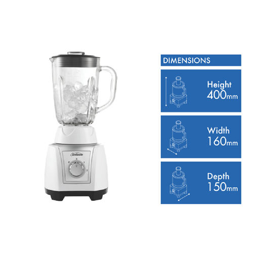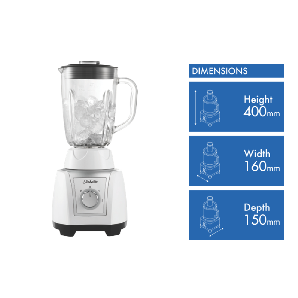 Blend and crush ice effortlessly with the powerful Sunbeam Ice Breaker Blender. This white blender features a 550 watt motor and stainless steel blade system to pulverize ingredients in seconds. With a 1.25L jug capacity two speeds and dimensions of 160mm x 400mm x 150mm this 3.6kg blender is ideal for preparing smoothies frozen drinks sauces and more. The heavy duty stainless steel construction ensures durability and longevity. Say goodbye to frustrating ice chunks and enjoy silky smooth frozen beverages. The stainless steel blades make quick work of crushing ice into a fine powder. Create mouthwatering margaritas daiquiris and piña coladas or use it to prepare nutritious fruit and vegetable smoothies packed with vitamins. The compact design allows convenient storage in most kitchens. With its robust motor and sharp blades this blender helps you make delicious drinks and meals for the whole family. Experience the convenience of one-touch operation. The Sunbeam Ice Breaker Blender will be your new favorite kitchen appliance. The manufacturer's part number for this product is PBT2000WH. Check out the Sunbeam Ice Breaker Blender today.