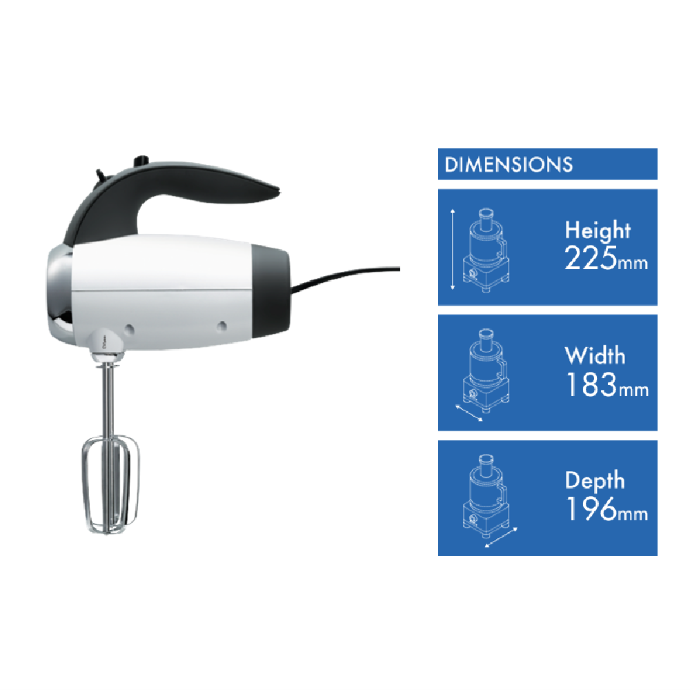 • Hand mixer with V-groove beaters and whisks