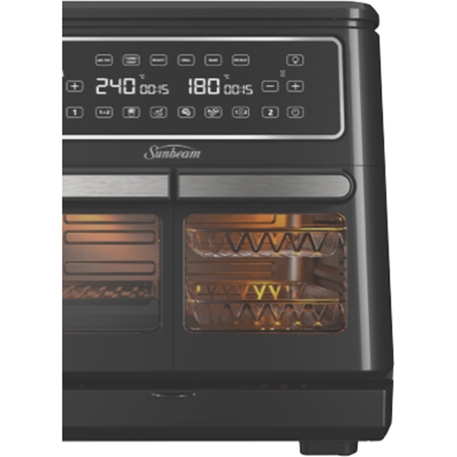 Cook multiple dishes at once with the versatile Sunbeam Multi Zone Air Fryer Oven. This 2400W air fryer features independent dual cooking zones each with a 5.5L capacity allowing you to sync and match cooking times for different foods. With a range of preset programs for fries chicken meat and veggies it takes the guesswork out of air frying. The illuminated touch controls give you precision over 11 cooking modes like Air Fry Bake Roast and Grill. Circulating hot air at high speeds the Nutricrisp Technology ensures fast even results. With 9 included accessories like baskets trays and a removable handle you can cook everything from crispy fries to juicy roasts. Promising healthier meals with little to no oil the 360 degree airflow system cooks dishes to crispy perfection. This 11.4L air fryer oven simplifies cooking multiple dishes at once with customizable time and temperature settings. The removable accessories and oven walls are dishwasher safe for easy cleanup afterwards. Measuring 39cm wide 36cm high and 36cm deep this countertop oven is an ideal addition to any kitchen. The manufacturer's part number for this product is AFP6000BK. Seamlessly multitask your cooking with the Sunbeam Multi Zone Air Fryer Oven.