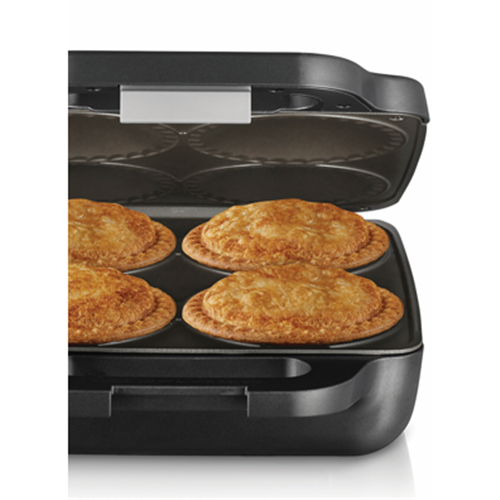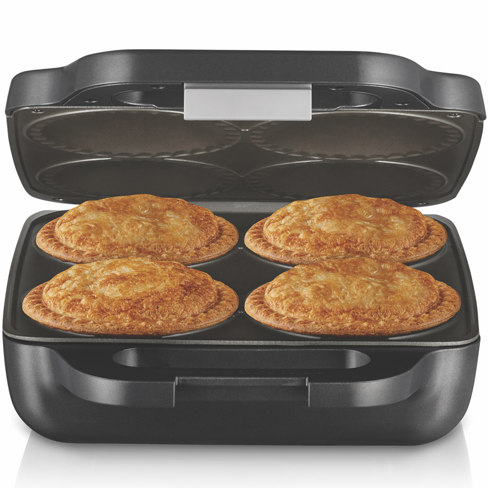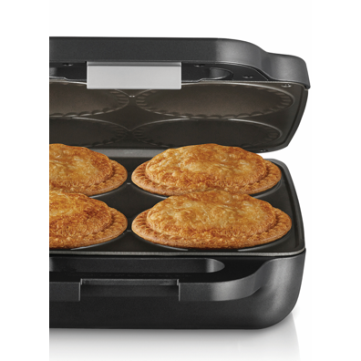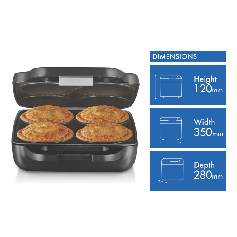 Bake up some delicious homemade pies for the whole family with the Sunbeam Pie Maker 4 Cup. This versatile pie maker features deep non-stick plates and a handy crimper seal to help you easily make up to 4 pies at once in your own kitchen. With its powerful cast in element it heats up quickly and evenly to ensure your pies are perfectly golden on top and bottom every time. The included pastry cutter makes dividing and shaping dough a breeze. Say goodbye to store-bought and create your own personal pies for breakfasts desserts or anytime snacks. From sweet apple to hearty chicken pot pie let your imagination run wild. Make single serve pies for kids' lunches or larger pies to share. The non-stick coating prevents messes and makes cleanup a snap. Enjoy fresh baked pies bursting with your favorite fillings in minutes with the Sunbeam 4 Cup Pie Maker. The manufacturer's part number for this product is PM4800. Seize the chance to whip up homemade pies for your family with this pie maker.