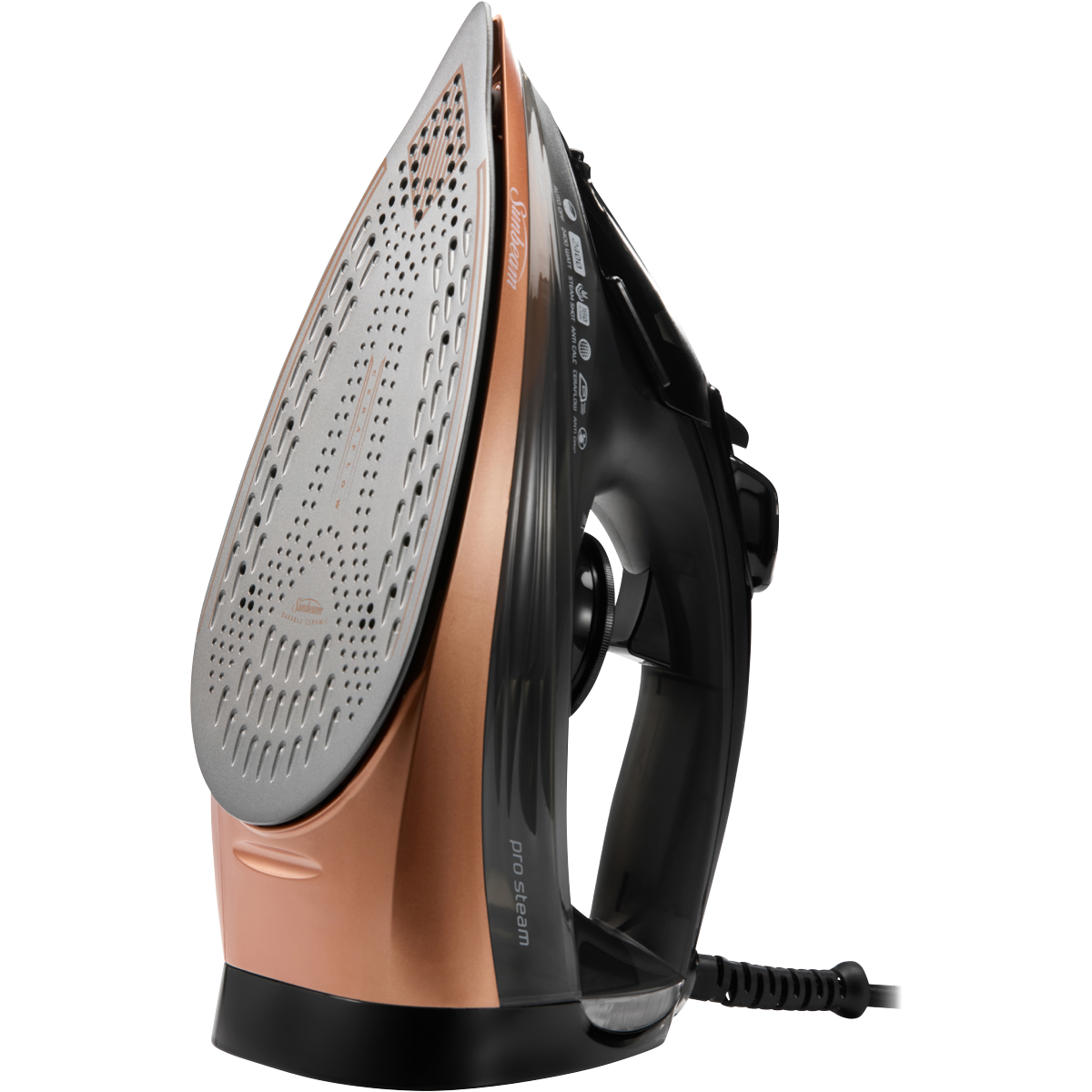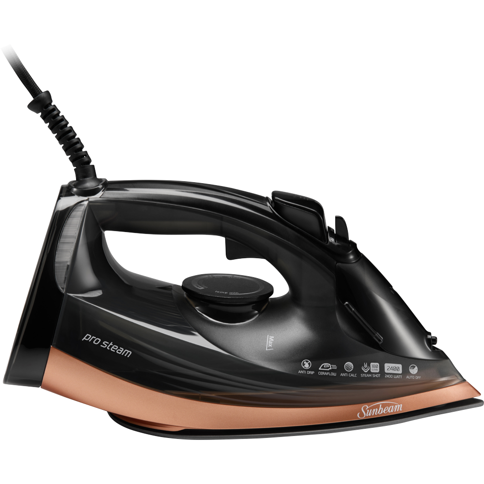 Tired of wrestling with stubborn wrinkles? Meet the Sunbeam Pro Steam Sonic Iron SRC4700 your new secret weapon for effortlessly crisp and smooth clothes. With a powerful 2400 watts and an impressive 40g/min continuous steam output even the most stubborn creases don't stand a chance. The CeraFlow ceramic soleplate glides smoothly over fabrics while the 180g/min steam shot blasts away deep-set wrinkles. Need to freshen up hanging garments suits delicates cushions or curtains? No problem - just use it vertically! The 300ml easy-fill water tank and anti-drip anti-calc and self-clean features make maintenance a breeze. Weighing just 1.06kg and measuring 295 x 123 x 145mm it's easy to handle too. Plus with auto shut-off for safety and a generous 2-year warranty ironing just got a whole lot more enjoyable with the Sunbeam SRC4700.