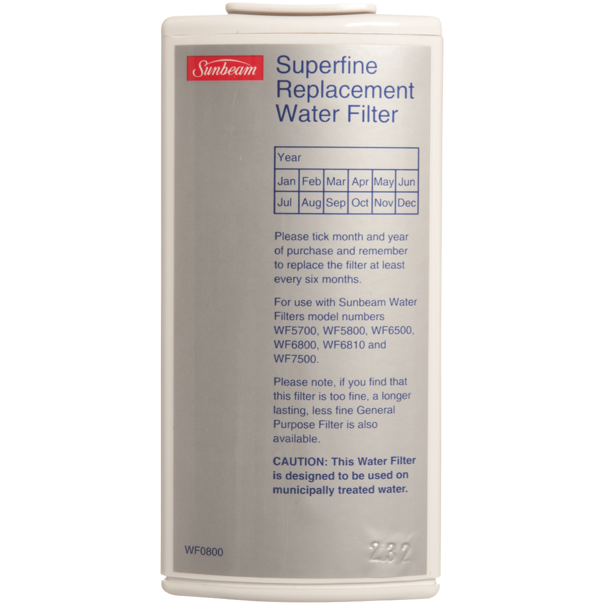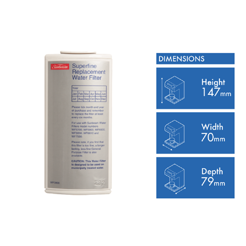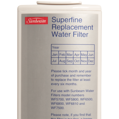 Refresh your home's water with the Sunbeam Pure Source Water Filter Cartridge. This replacement filter cartridge fits select Sunbeam water filtration systems providing cleaner fresher tasting water straight from the tap. The advanced carbon filter effectively reduces chlorine taste and odor eliminating unpleasant aftertaste and delivering water that's crisp and pure. The compact cartridge design installs easily under sinks and refrigerators with quick twist or click fittings making filter changes a breeze. Enjoy water that's filtered to remove sediment and other impurities without sacrificing flow rate. With each filter lasting 6 months or 300 gallons you can rely on having an uninterrupted supply of fresh filtered water for all your cooking and drinking needs. The Sunbeam Pure Source Water Filter Cartridge keeps your family hydrated with water that's free of unwanted tastes and odors. See the difference filtered water can make in your home. The manufacturer's part number for this product is WF0700.