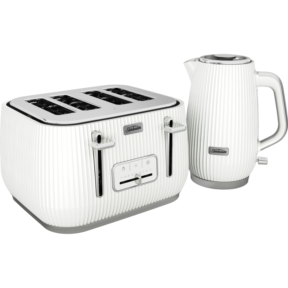Start your day right with the Sunbeam Radiance Collection Breakfast Pack in crisp white featuring a 1.7L kettle and 4-slice toaster. The kettle's 360-degree swivel base makes pouring easy while the powerful 2400W element heats water quickly. Your toast will be just how you like it thanks to the toaster's 9 browning settings plus handy crumpet defrost and reheat functions. The high lift lever makes grabbing smaller items safe and the dishwasher-safe crumb tray keeps cleanup simple. Both appliances are crafted from durable metal with a 1-year warranty. Model PUP3500WH.